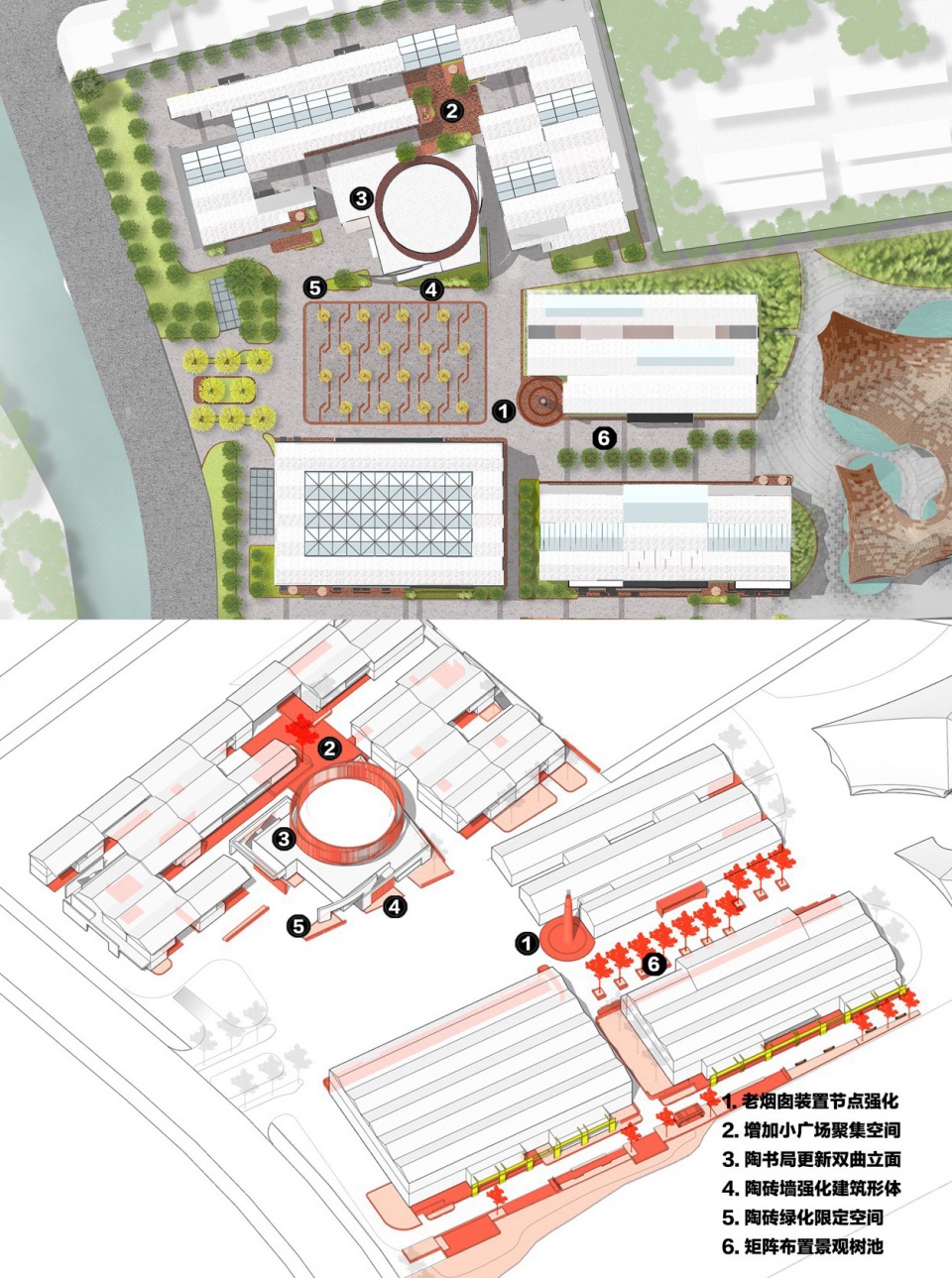 陶文化活力场以陶书局与工业烟囱为双核心,打造了一个集创意、文化、展示、体验、工坊、活动于一体的文化片区。