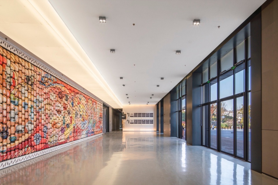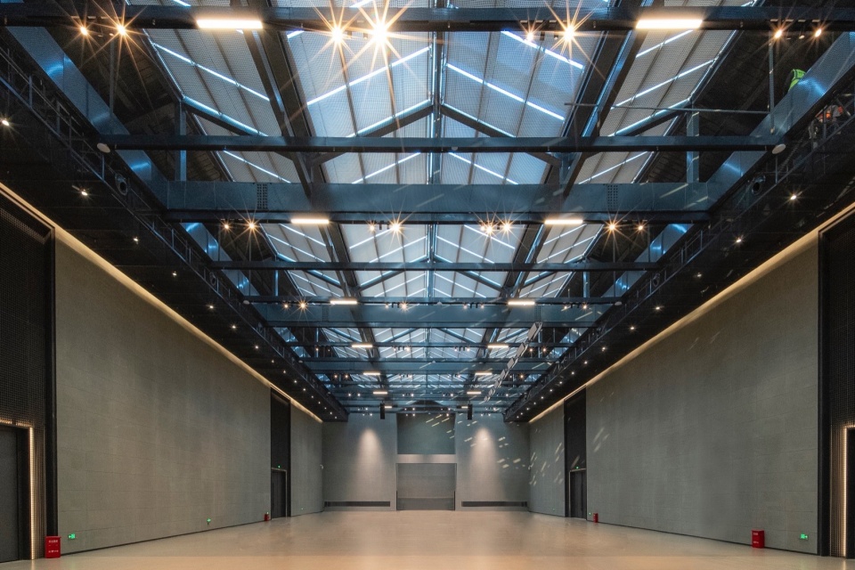 In the reception lobby, the display of Jiang Guoxing’s ceramic artworks achieves an organic fusion of industrial texture and artistic vitality. The strategic use of transparent glass volumes partitions functional spaces while enhancing overall transparency, facilitating a dynamic interplay between industry, culture, and art. The exhibition hall emphasizes the preservation of iconic industrial materials such as I-beams, exposed concrete, and metal grids. The original framework and steel roof structure are retained, with newly added horizontal equipment installed symmetrically along both sides. This integrated approach unifies lighting systems and sun-shading functions, achieving a perfect equilibrium between technology and aesthetics.
