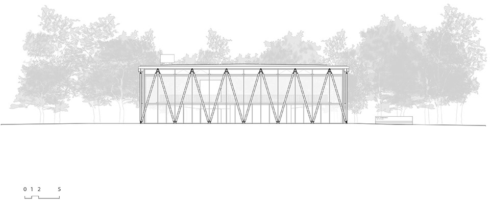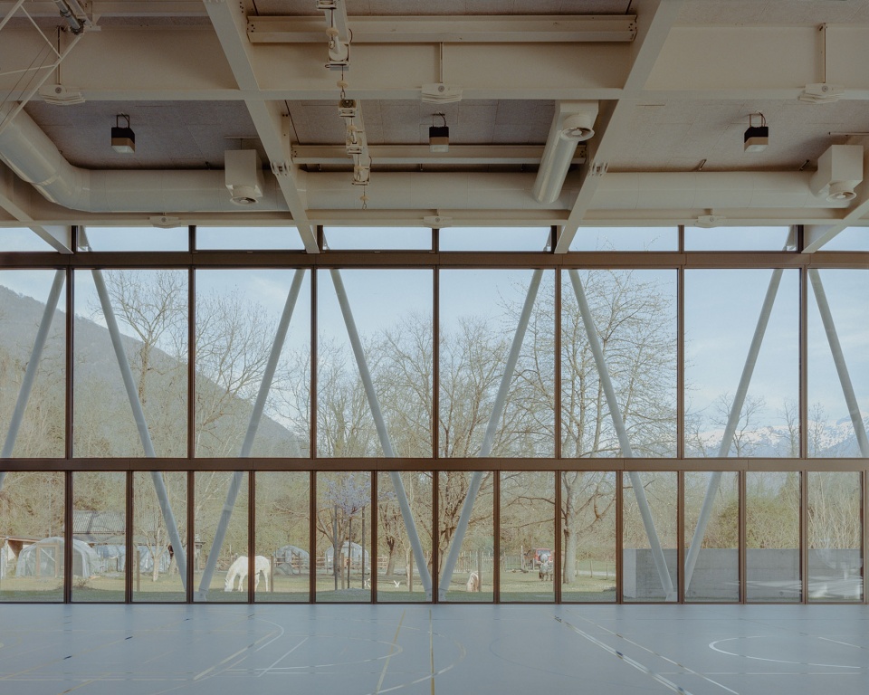 新体育馆的建设成为一个契机,为沿梅莱扎河冲积平原公园打造一个集聚空间、一个地标。该公园事实上是该市主要的公共空间。它不仅仅是一个体育馆,更是一个有顶的开放空间、一座剧场、一间林中大厅、一片林间空地上的屋顶。森林成为建筑的主立面和戏剧化背景,调节冬夏日照强度的同时,也过滤了光线的进入,实际上定义了室内空间的深度。主要的南向入口朝向梅莱扎河方向,可直接通向上层看台、地下更衣室以及厨房。