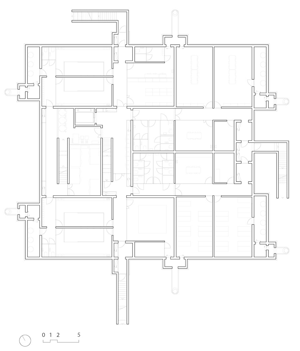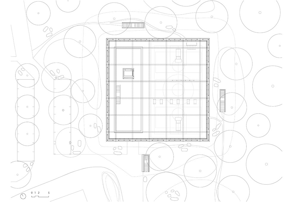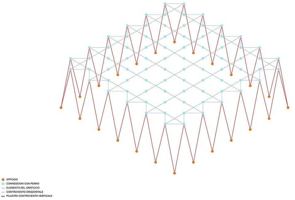 The entire basement, which can be used as civil defense shelters, hosts the sport hall services, multipurpose rooms, locker rooms, archives and storage rooms, so that the main hall is brought to the ground floor. The basement lobby connects staircase and elevator with the locker rooms, kitchen, public restrooms and shelters, and allows easy management of public activities that can be held in the sport hall. The plan is a square shape of 30 meters per side. It is a mixed structure, the underground part in reinforced concrete and the above-ground part in steel.