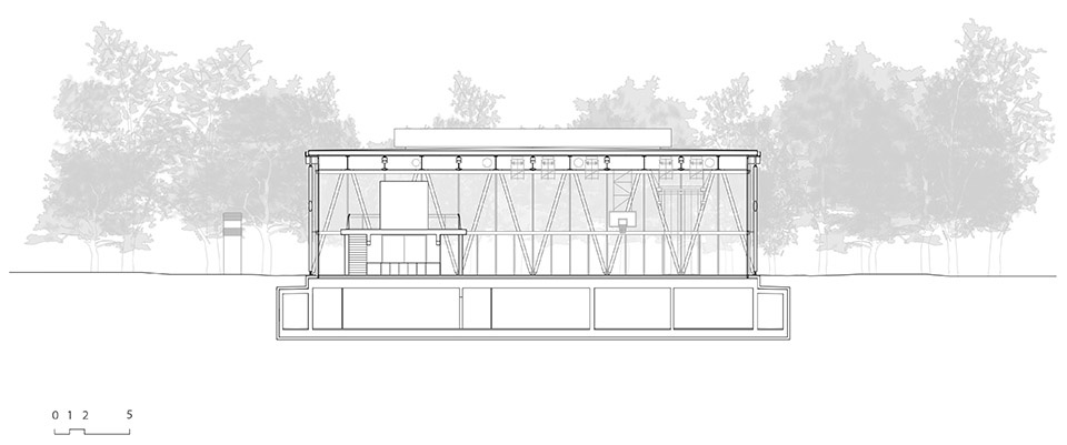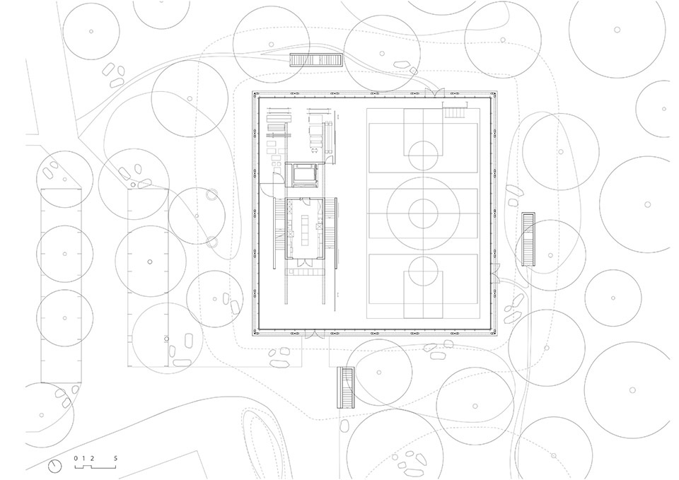 The construction of the new Sport hall becomes an opportunity to create a gathering place, a landmark along the Melezza River floodplain park that is in fact the main public space of the municipality. It is not just a sport hall but a covered space, a theater, a hall in the middle of the woods, a rooftop in the clearing. The forest becomes the main façade and theatrical backdrop of the building, filtering the entrance of light by regulating the radiation in both winter and summer months, and actually defining the depth of the interior space. The main southern entrance faces the direction of the Melezza River, and leads directly to the upper balcony, the basement changing rooms, and the kitchen.