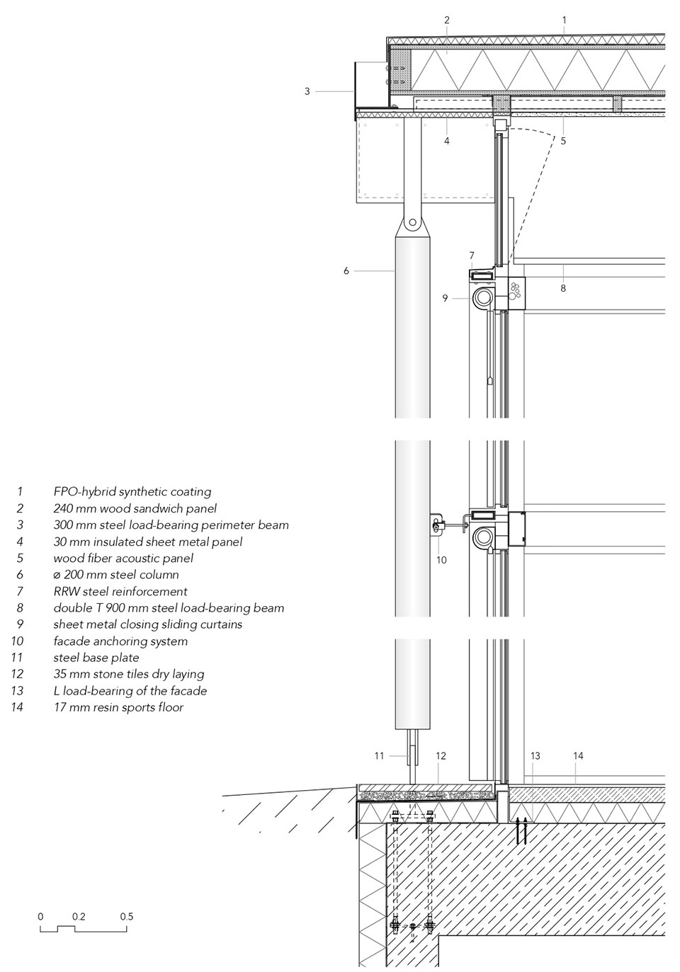 整个地下层可用作民防避难所,容纳了体育馆的配套设施、多功能厅、更衣室、档案室及储藏室,从而将主大厅设置在地面层。地下门厅连接楼梯与电梯,并可通往更衣室、厨房、公共洗手间与避难空间,便于对体育馆内公共活动的统一管理。建筑平面为边长30米的正方形,结构为混合结构:地下部分为钢筋混凝土,上部结构为钢结构。