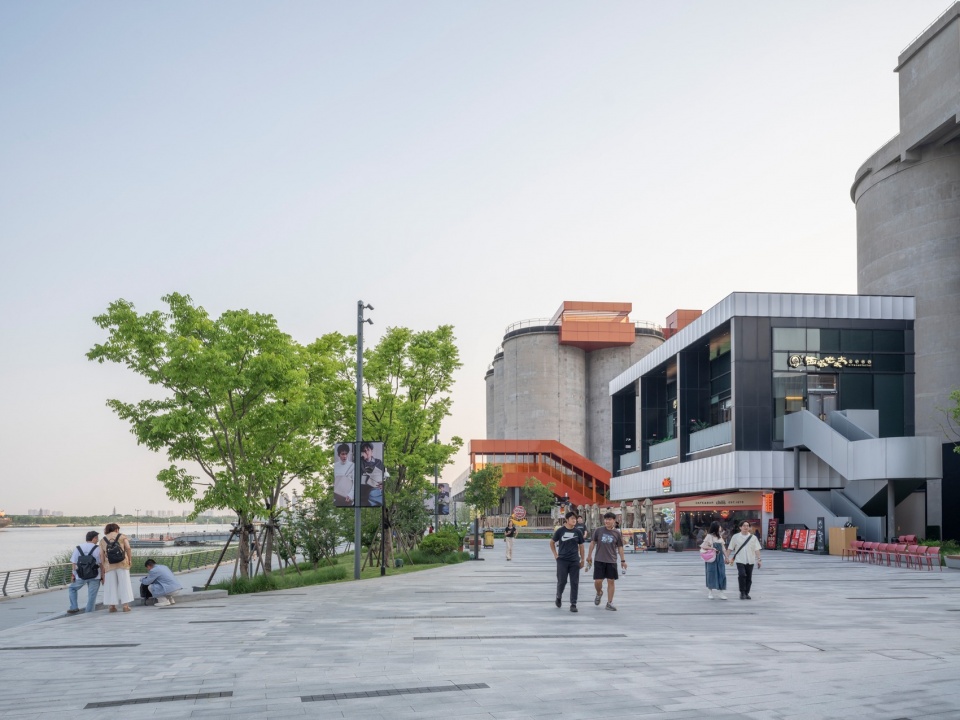 改造后的工业筒仓与工厂建筑成为新区域的视觉核心。这些粗犷而富有纪念性的混凝土体量,在亮橙色楼梯与电梯井的点缀下获得了强烈的视觉识别度。在巨大的“M工厂”底层设有“BLOOMARKET”复合餐饮空间,融合了集市与高端用餐体验;而通过原有传送带改造的橙色楼梯可通往上层的多功能无柱文化空间,可用于展览、会议、时装秀与演出等活动。原筒仓则被改造成室内攀岩馆,其外立面设有攀岩路线,引导人们登上屋顶或一层露台,俯瞰江景。