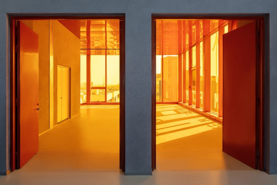 ▼亮橙色楼梯内平台,landing of the bright orange stairs