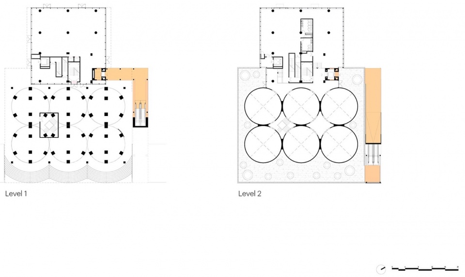 ▼筒仓一层与二层平面图,Silo floorplan level 1 + 2