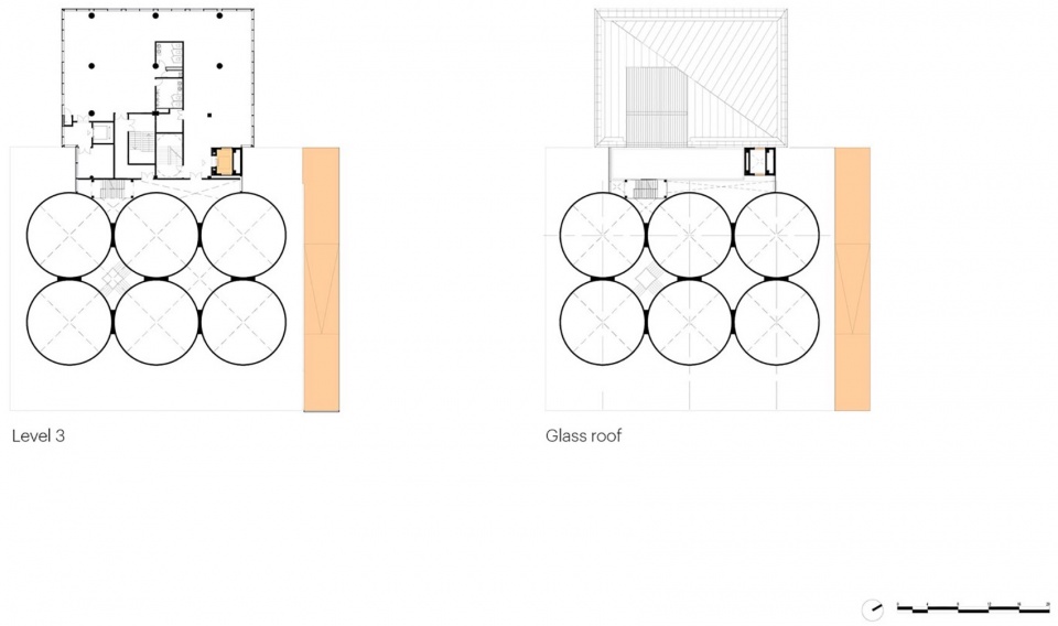 ▼筒仓三层与玻璃屋顶平面图,Silo floorplan level 3 + glass roof