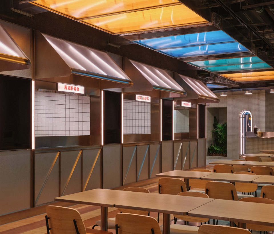 通过外立面的现代设计元素,人们被自然地引入食集。青绿色瓷砖构成的弧形体量延伸至室内,搭配绿植和鲜艳的霓虹灯招牌。食集分为两层,提供即食餐饮和公共就餐区,汇集中式、葡式、日式、泰式和台式等多种菜系。