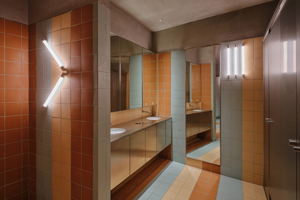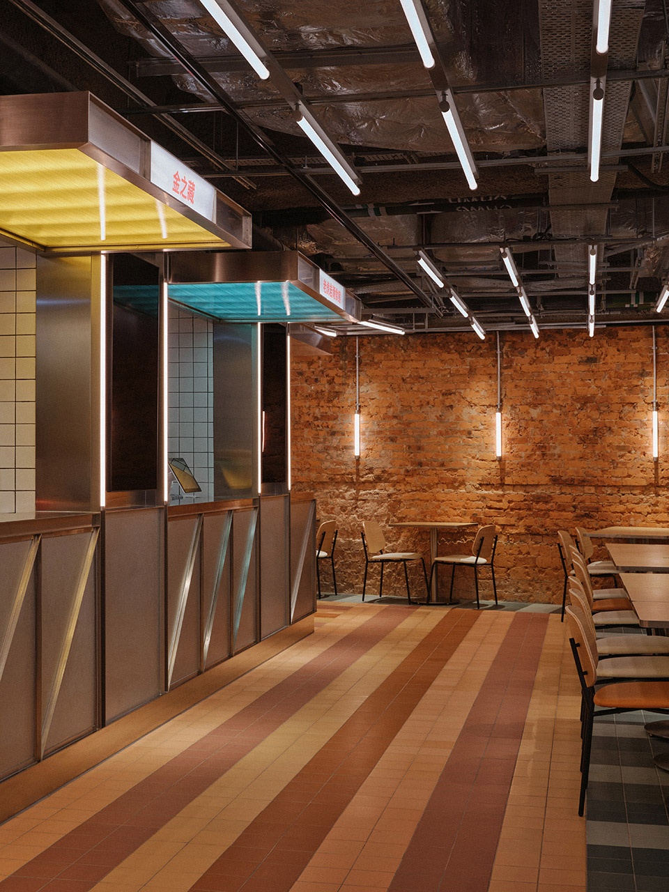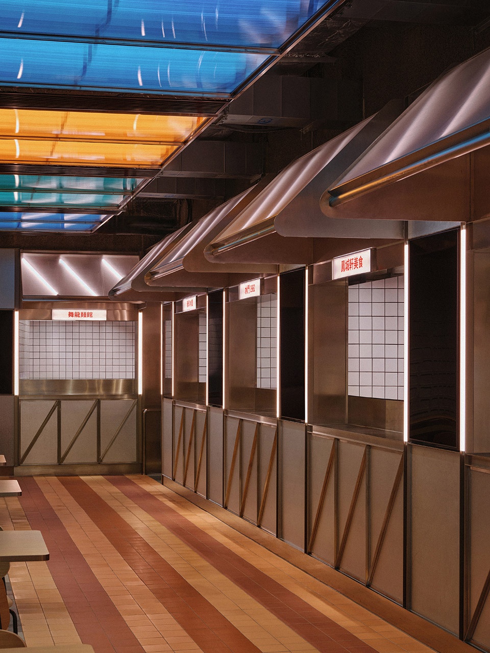 新的设计采用工业材质基调,材料语言简洁质朴:镀锌钢板、金属网、瓷砖和混凝土砖,这些常见于街区巷道的材料在这里被更富创意地方式组合使用,搭建具有实用性的基础空间框架。参考周边巷弄色彩缤纷的店铺门面,不同色调的绿色和赤陶土瓷砖以条纹形式铺设于地面和墙面,形成方向感和动感。摊位以镀锌钢框架和顶棚界定,背后设置聚碳酸酯板照明。彩色灯箱点缀天花,营造出充满活力与能量的动态用餐空间。