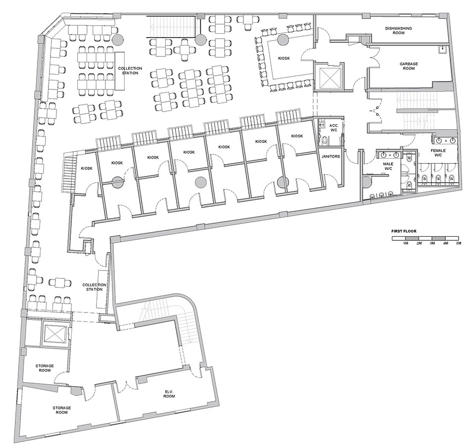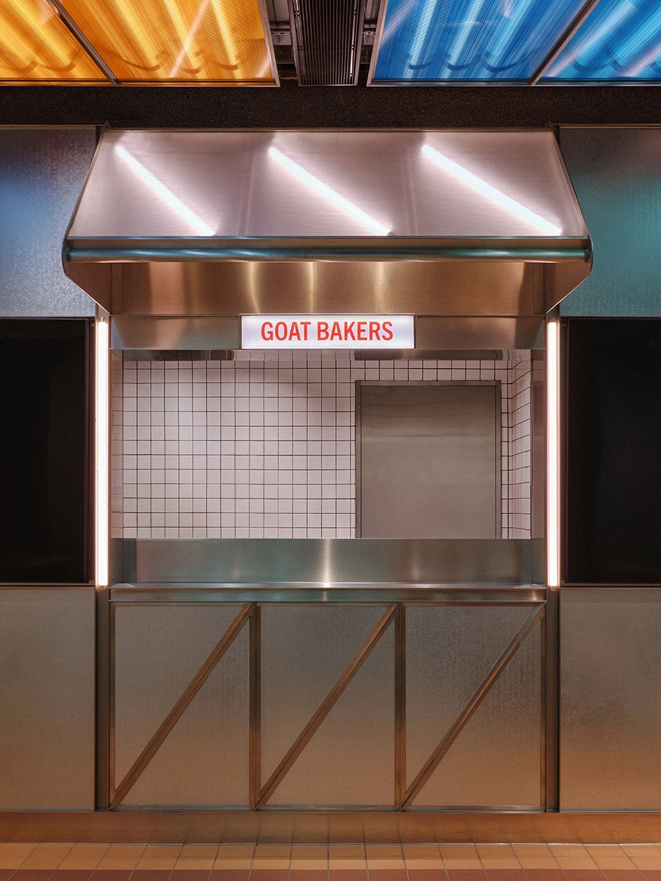 The new insertions utilized an industrial palette, simple and humble materials, that are commonly seen on the surrounding intimate laneways were used with a creative approach; galvanized steel, metal mesh, tiles and concrete bricks, providing a utilitarian framework. Referencing the colorful shop fronts of the area, tiles in different hues of green and terracotta were laid in stripes on the floors and walls, creating a sense of direction and movement. Vendors are framed in galvanized steel portals and canopies, with illuminated lighting set behind polycarbonate. Moments of colour punctuate the ceiling with colored hovering light boxes, providing a dynamic dining space with hype and energy.