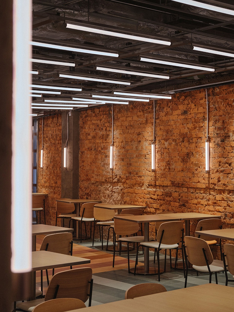 走近建筑时,人们可以看到过去与未来的动态交汇:1920年代现代主义建筑被完好保留,外立面装饰着霓虹灯和发光汉字,这是历史街区景观的标志性特征。这一主题通过圆弧造型与鲜明灯光、都市材料的并置以及在内外空间使用上的延续性,打造一个对年轻群体更具有吸引力的街头外观。