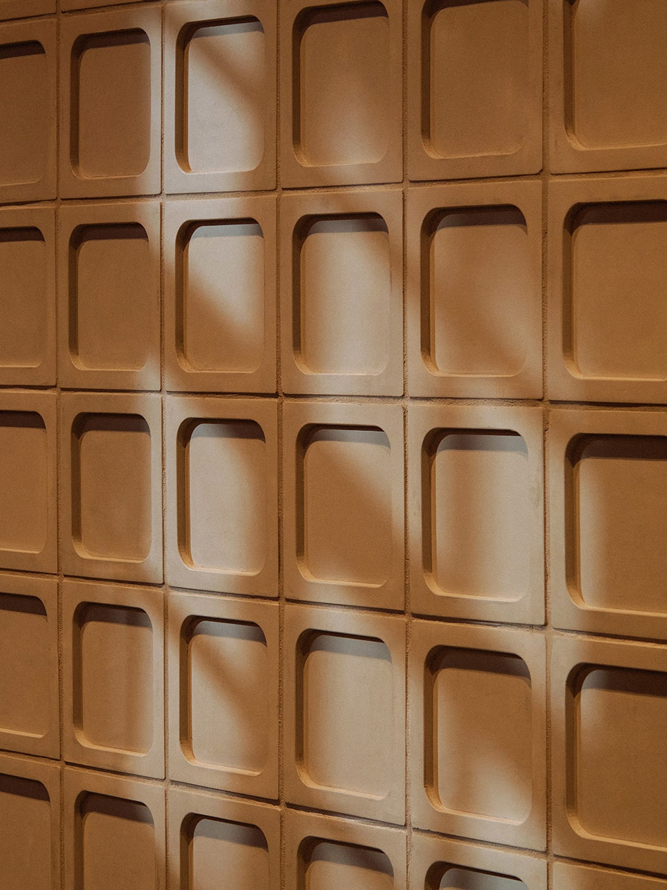 ▼赤陶土瓷砖以条纹形式铺设于墙面,