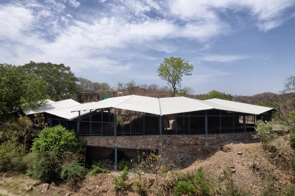 The use of structural steel enabled the architects to create a load-bearing skeleton of portal frames over the landscape, preserving existing vegetation while following the contours of the land. This approach led to the integration of a mature tree and a rock formation within the building. Stone masonry walls along the outcrop create a sense of enclosure but form only a low wall on the other side, enabling panoramic views of the surrounding farmland.