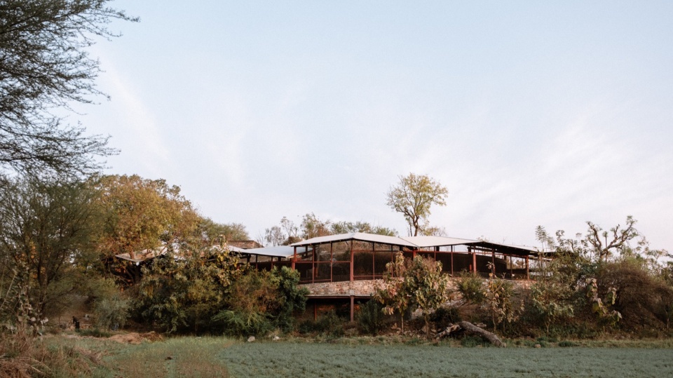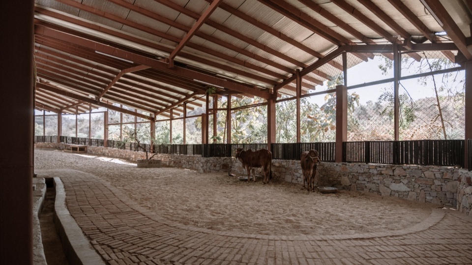 由英印建筑事务所 Studio Saar 设计建造的 Gaushala,是一座可持续发展的全新奶牛养殖设施,位于印度南拉贾斯坦邦阿拉瓦利山脉的核心地带,专为饲养40头稀有本土吉尔牛(Gir Cows)而设。“Gaushala”在印地语与梵语中意为“牛棚”。项目选址于一处岩石突起的边缘,旨在最大限度保护周边的农田与树木。该地块能够有效抵御主导的西风,同时引入温和气流,不仅有助于驱赶蚊蝇,也能散去异味。由于地形复杂、地下布满岩石与粗壮树根,设计在施工过程中不断调整,最终形成了一种贴合场地语境的建筑回应。