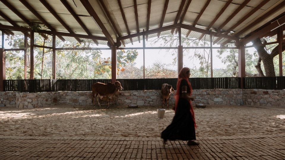Gaushala的内部以链状网格围栏封闭,保护牛群与工人免受野豹侵袭。地面由碎旧陶砖铺成,图案与排水系统由施工团队协同设计,既保证排水与防滑,也为牛群提供舒适的步行体验。建筑配备了简易的重力排污系统,用于农业废料收集与转化生物燃料,从而实现农场的自给自足运行。