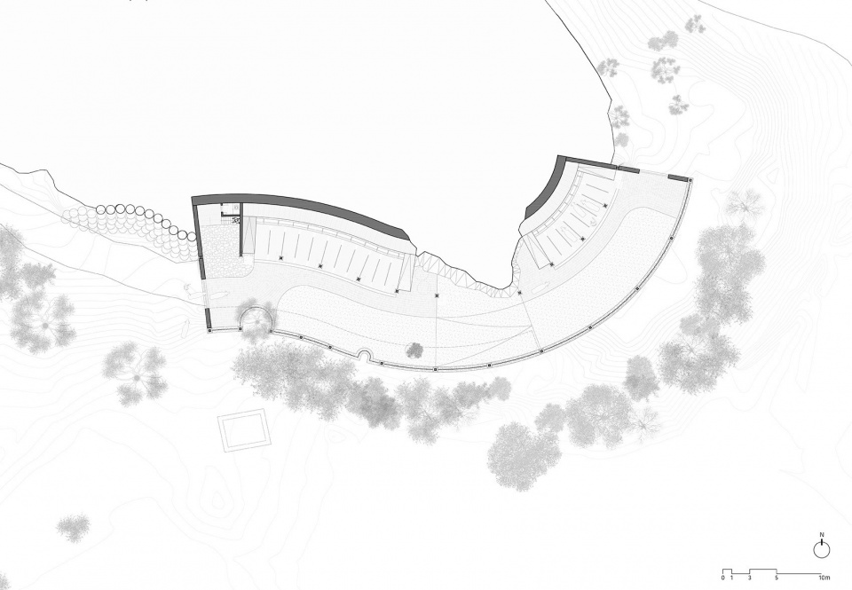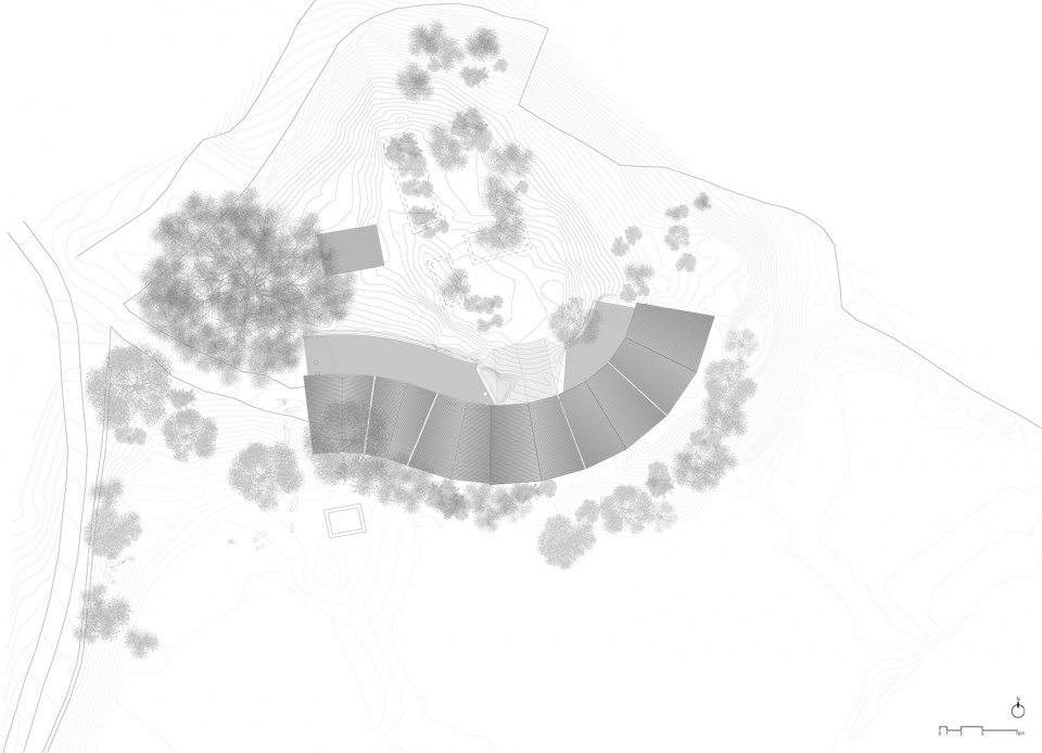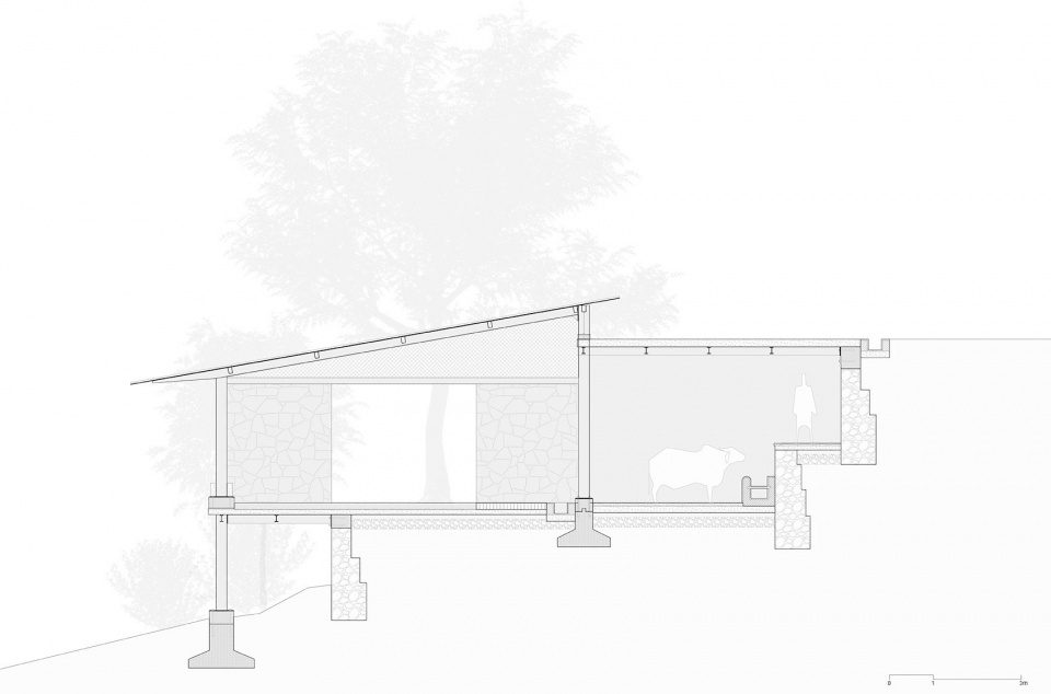 结构采用钢制门式框架体系,使建筑能顺应地形、悬于自然景观之上,从而最大限度保留了地面植被。这样的设计策略甚至将一棵成熟大树和一块天然岩体“嵌入”建筑之中。建筑靠岩体一侧建有石砌围墙,另一侧则仅设低墙,提供广阔田野的全景视野。