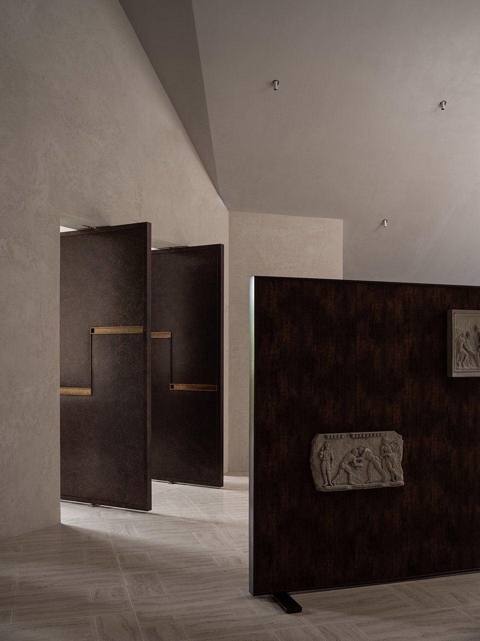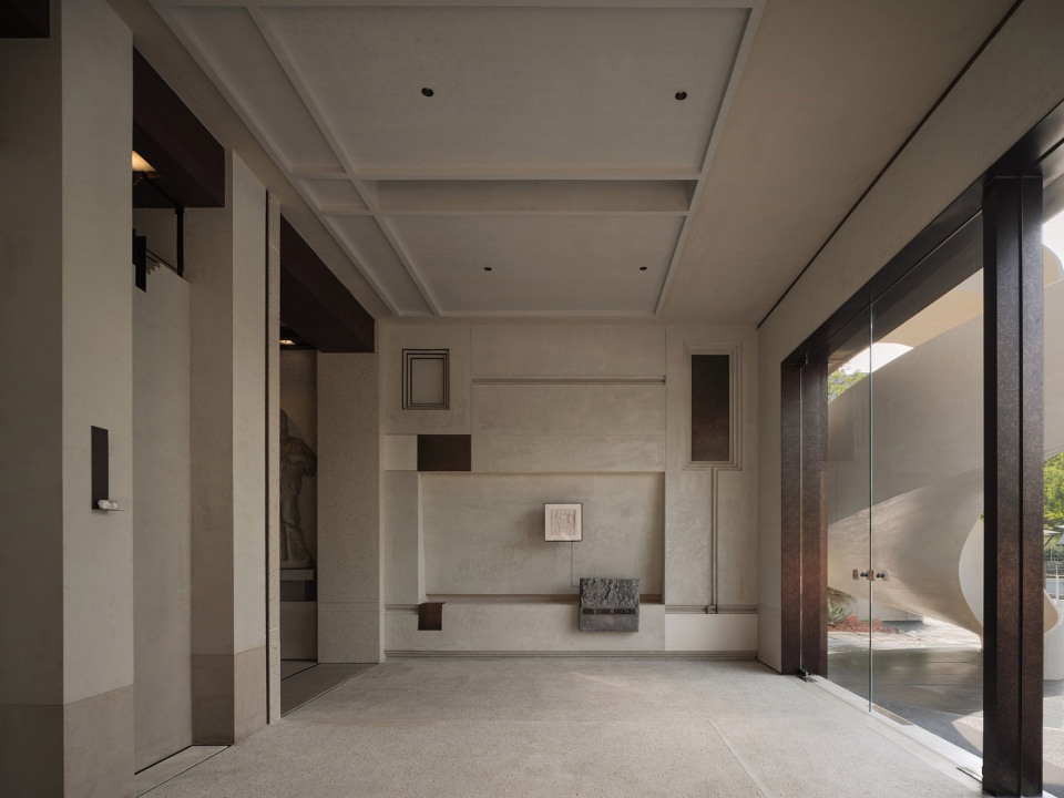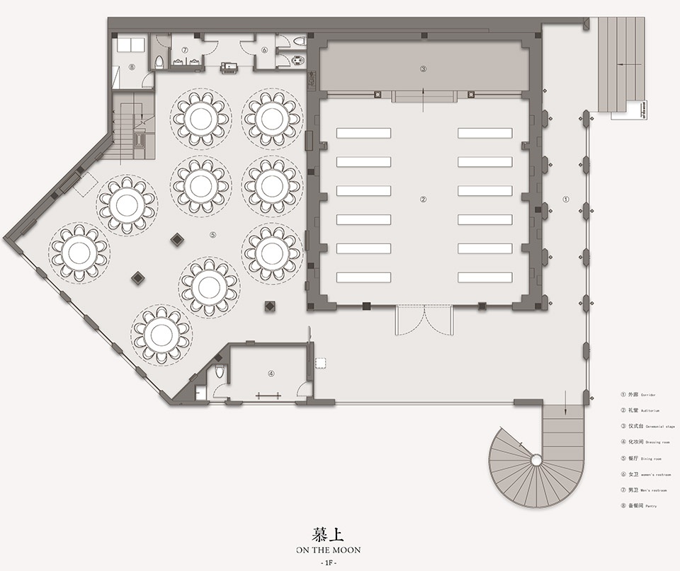 建筑保留原有的骨骼,尺度静默,光线逻辑仍在缓慢呼吸。原木嵌入混凝土与石质之间,温润而克制,在坚硬中,藏了一枚有温度的心脏。卡帕式解构主义轻声陈述细节,几何交互,形成某种庄重的节制。空气近乎凝固,低语也显得隆重。这是一场被光倾斜的见证,不喧哗,却足够庄严。空间以永恒之姿,铭刻一瞬的确认。精神的中轴,贯穿整座麓月礼堂。神圣,源于光 —— 一道熔金静静垂落。空间在抬升,感知被引向无声的高处。混凝土,吸收步伐的声响,层层研磨,纹理消隐,情绪随之内敛。没有冗余,只有结构的秩序感在支撑诚意。你在此并非主角,而是成为仪式的一部分,和光、时间,一起完成那句“我愿意”。