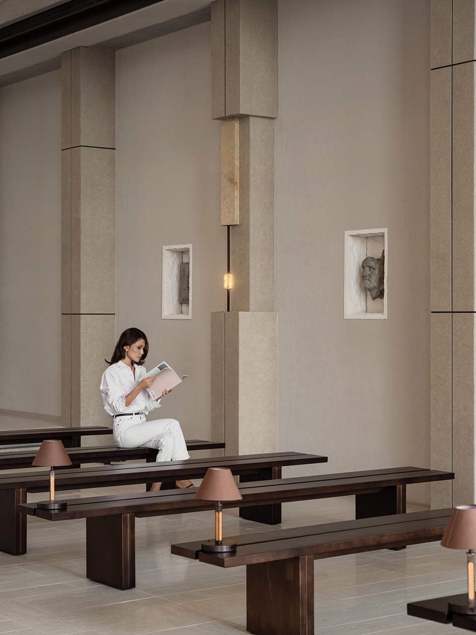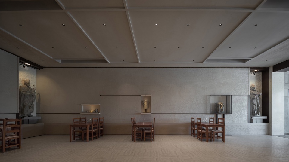 空间不主动邀请,而是温柔容纳。桌与桌之间,分寸刚好。光影留给社交距离,缓缓漫开,温和调节着呼吸的速度。结构不强调功能,而强调秩序中的自由。被安放,而非被安排;动作无需预设,交流亦可随性。关系在材质之间松动生长,空间成为情绪的容器。触感、光感、声场,在此达成一种无声的配合。进食,是建筑与身体的合谋;共享,是彼此沉默时的理解。空间成为精神的容器,情绪得以沉入其中,被完整托举。