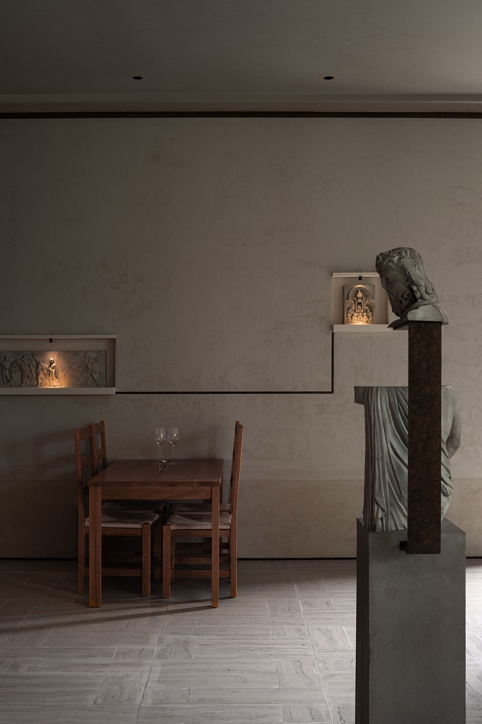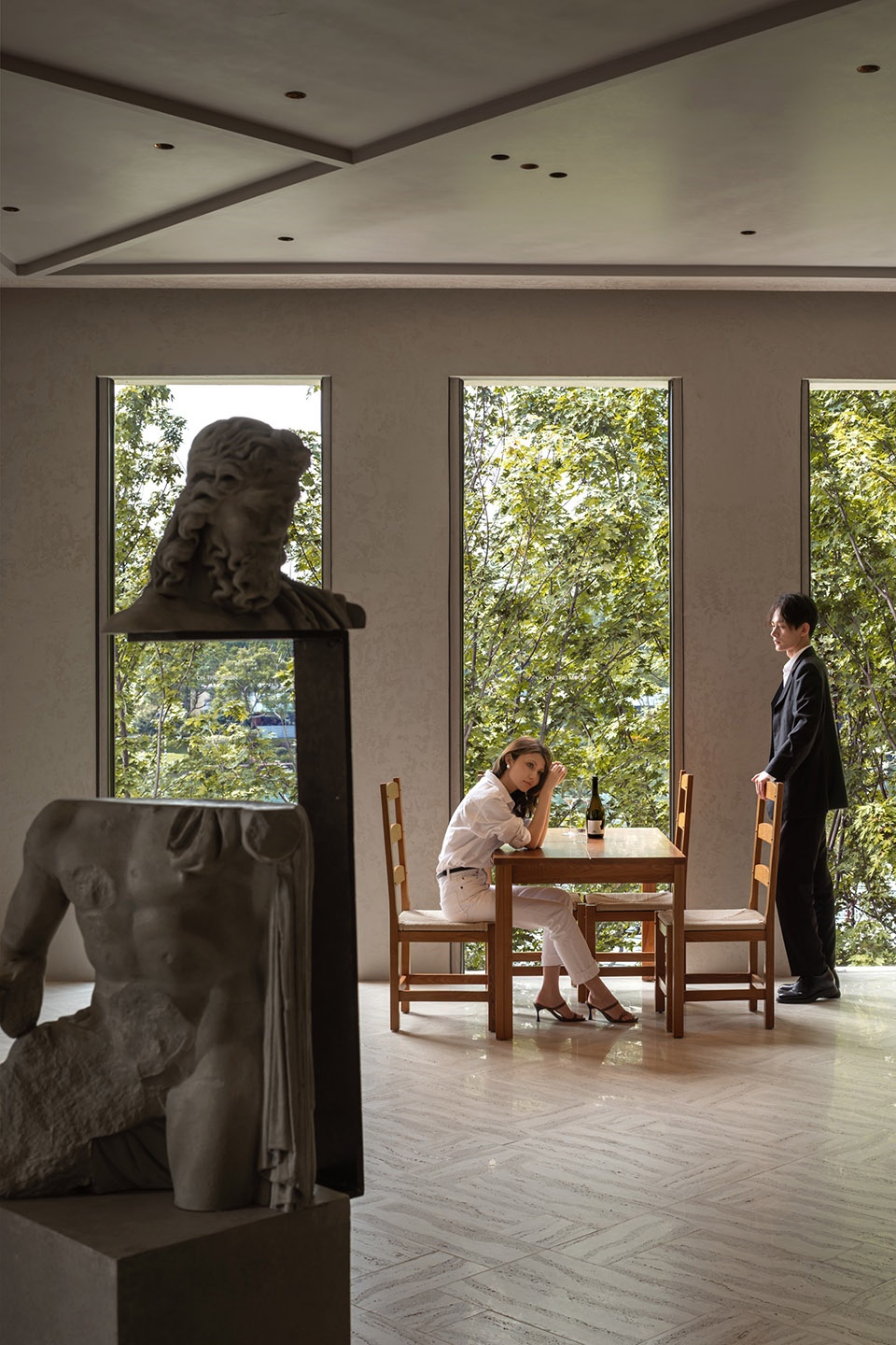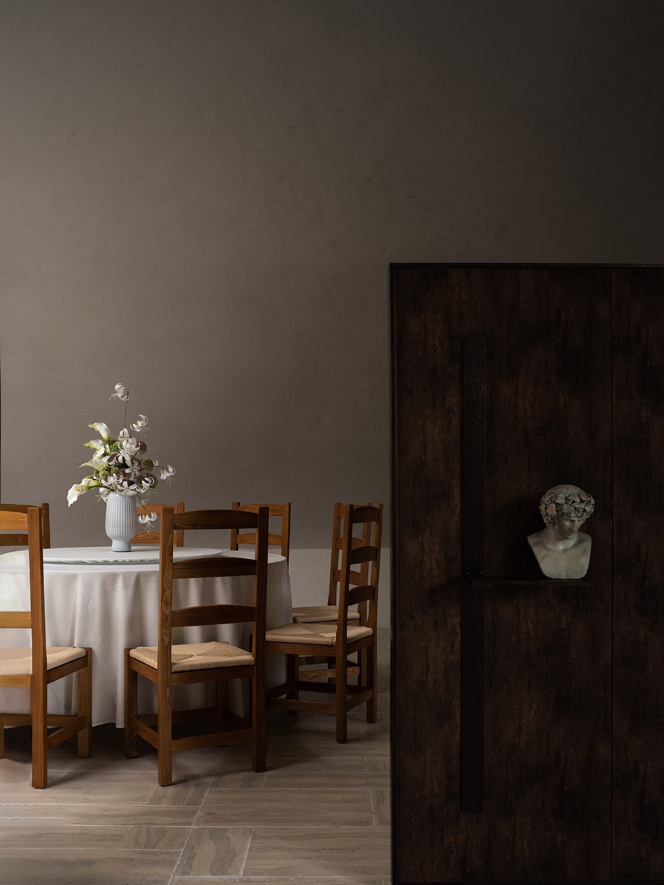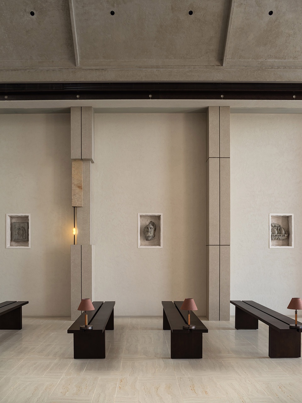 The space makes no demand, only a quiet welcome.Each table, perfectly spaced.Light drifts slowly— measuring distance, tempering breath.Structure does not emphasize function, but freedom within order.Placed, not arranged.Movements require no script; interactions may flow freely.Relations loosen and grow between materials— the space becomes a vessel for emotion.Touch, light, and sound come together here in silent harmony.Eating is a collaboration.between architecture and body.Sharing is an understanding, born in mutual silence.The space becomes a vessel for the spirit, where emotions sink deeply, fully supported and embraced.