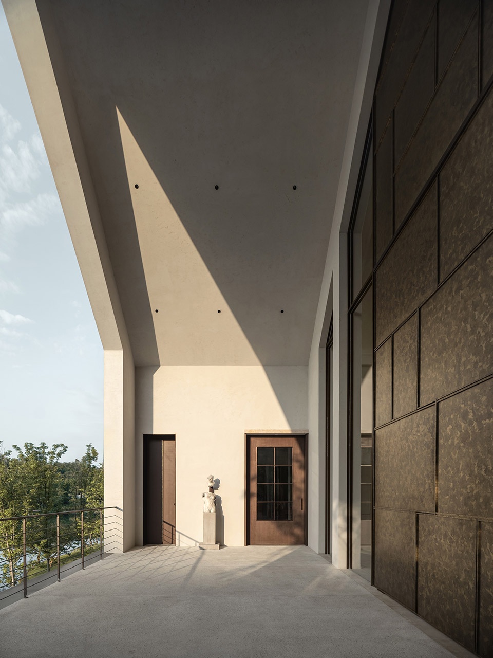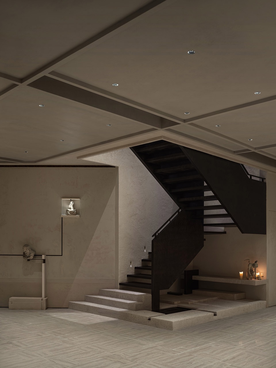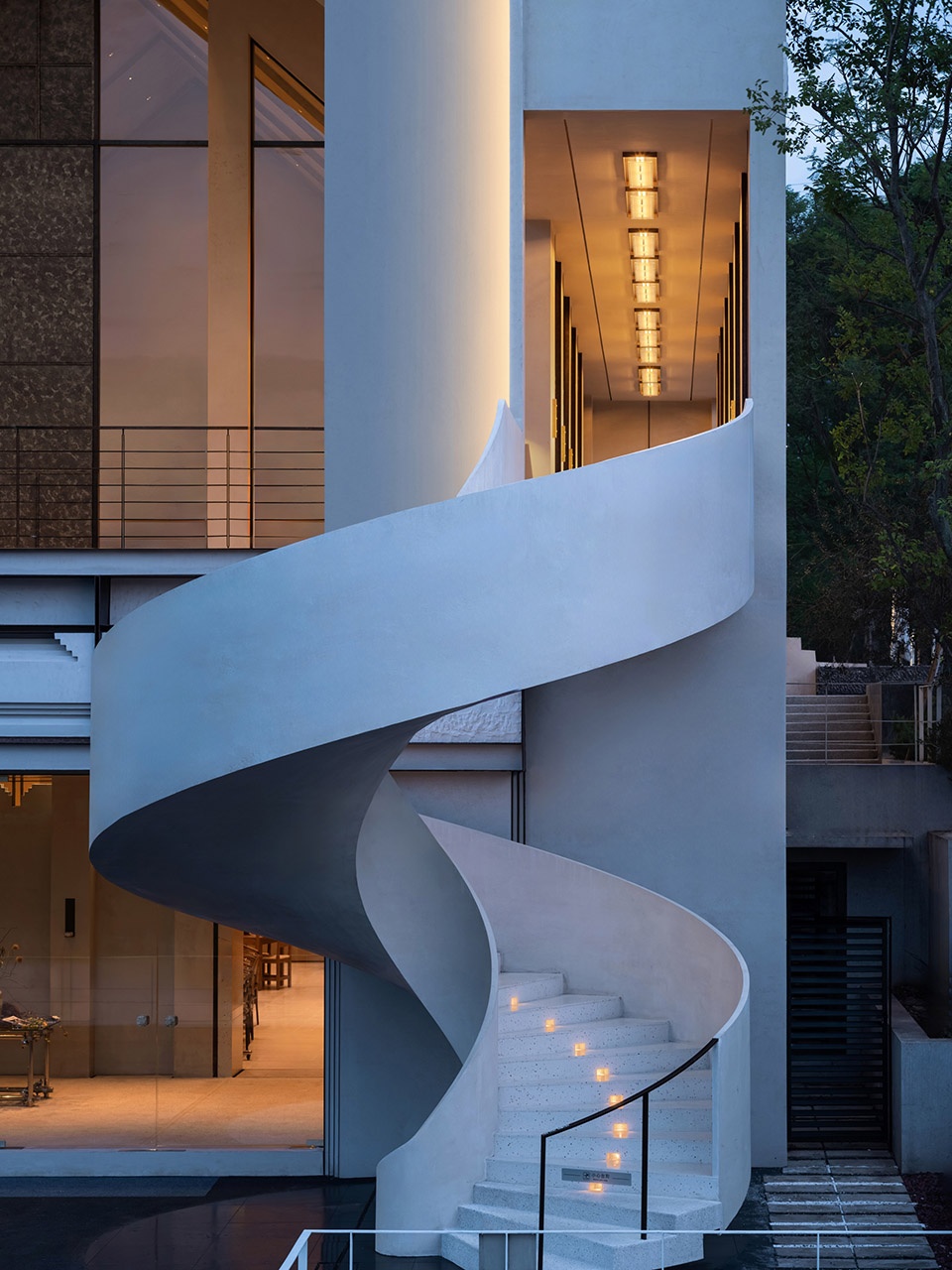 风留驻于光影之间,时间被轻轻放缓。双层露台不设方向,只提供一种被托住的自由。空气与视线构成暂停语句,边界松动,情绪缓释。建筑在此松开了结构的手,将一切还给流动的空气。旋转楼梯以曲线轻悬,如风迹游走于静止的立面之上,弧度削弱重力,线条绕过秩序。上下行间,非路径,而是过渡;引导着身体进入一种新的节奏——沉静、非线性、无需抵达。