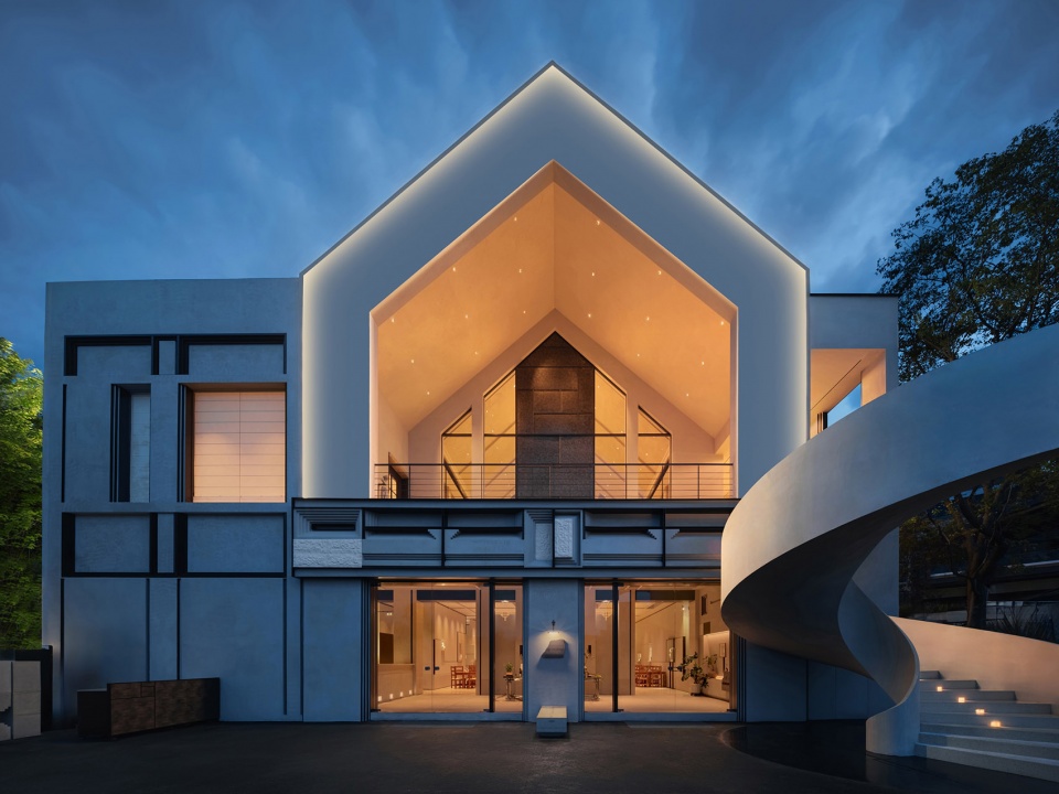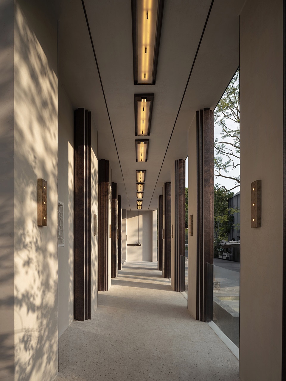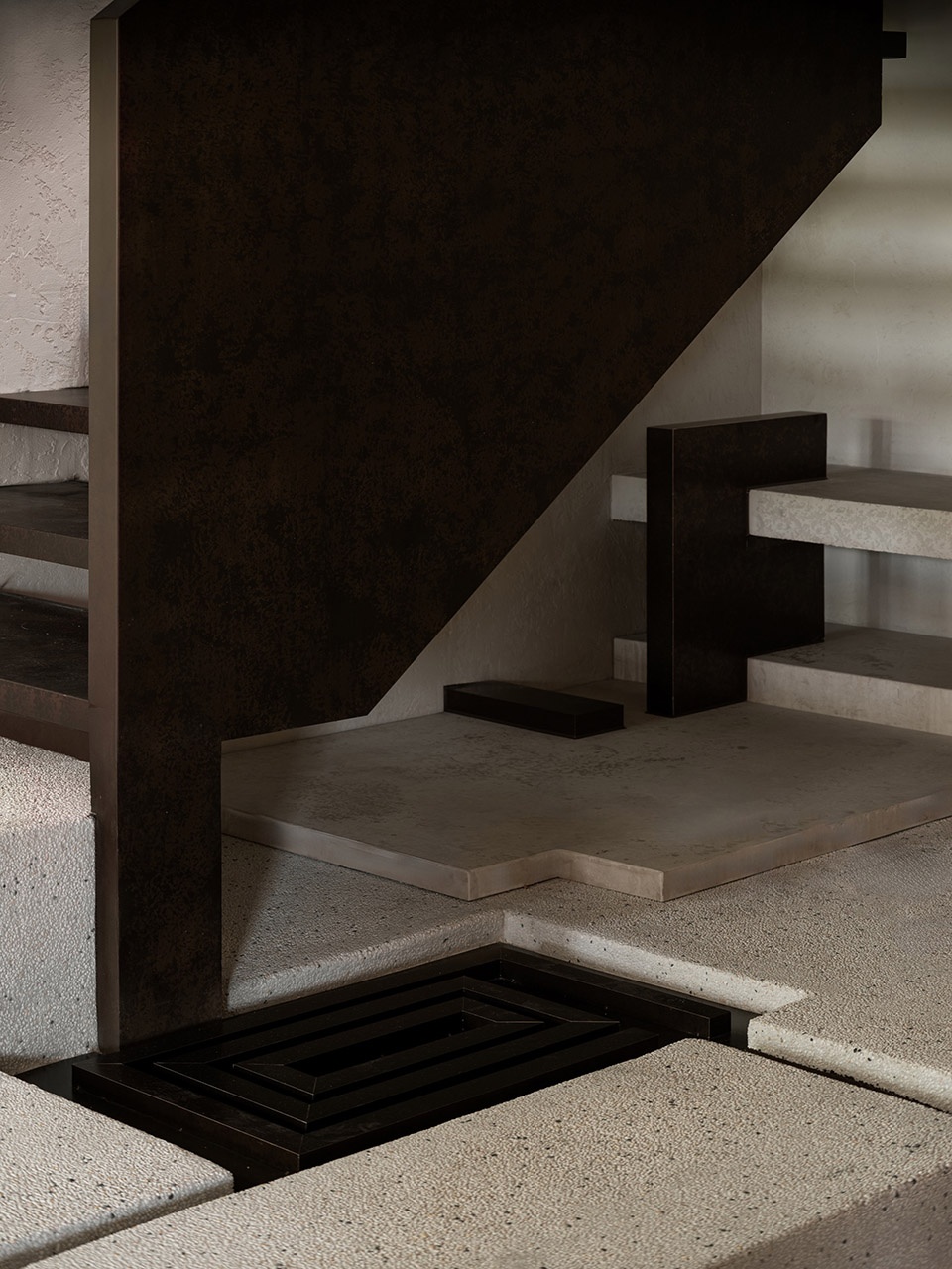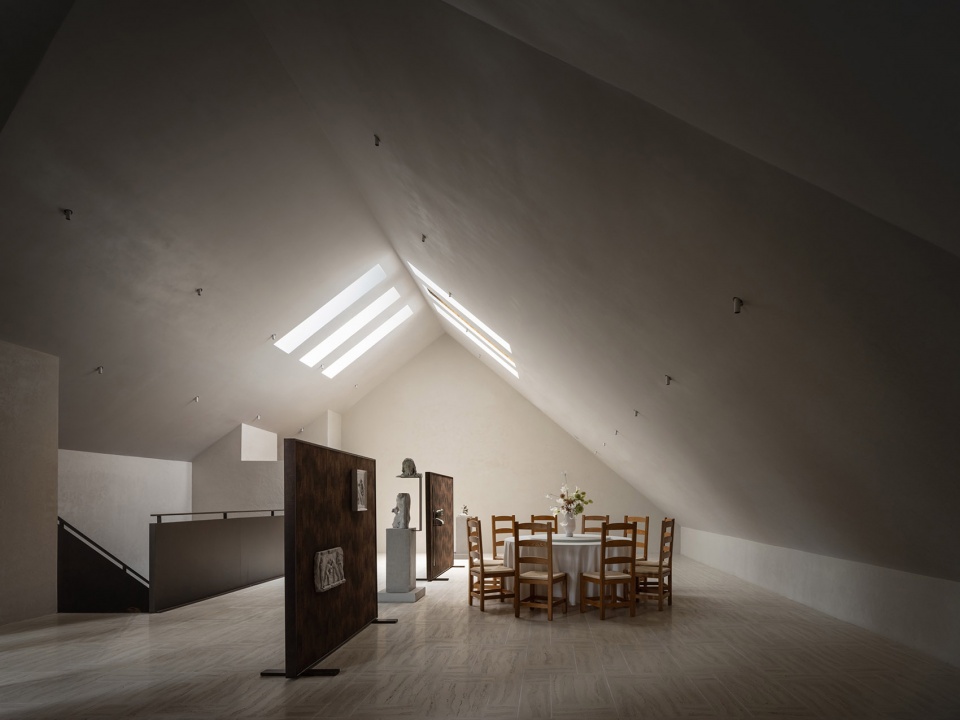 风留驻于光影之间,时间被轻轻放缓。双层露台不设方向,只提供一种被托住的自由。空气与视线构成暂停语句,边界松动,情绪缓释。建筑在此松开了结构的手,将一切还给流动的空气。旋转楼梯以曲线轻悬,如风迹游走于静止的立面之上,弧度削弱重力,线条绕过秩序。上下行间,非路径,而是过渡;引导着身体进入一种新的节奏——沉静、非线性、无需抵达。