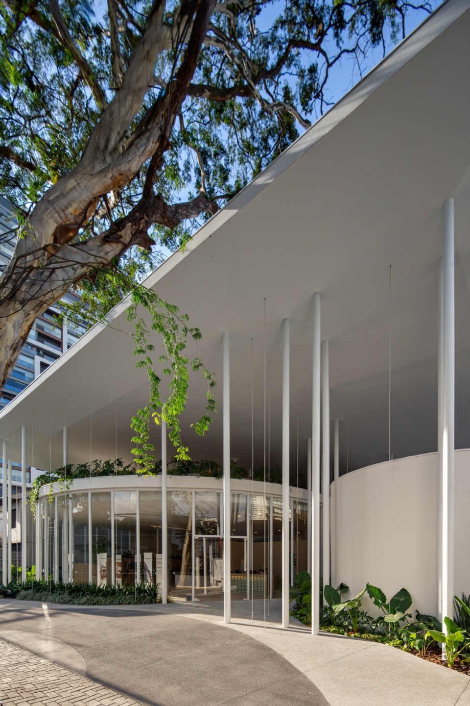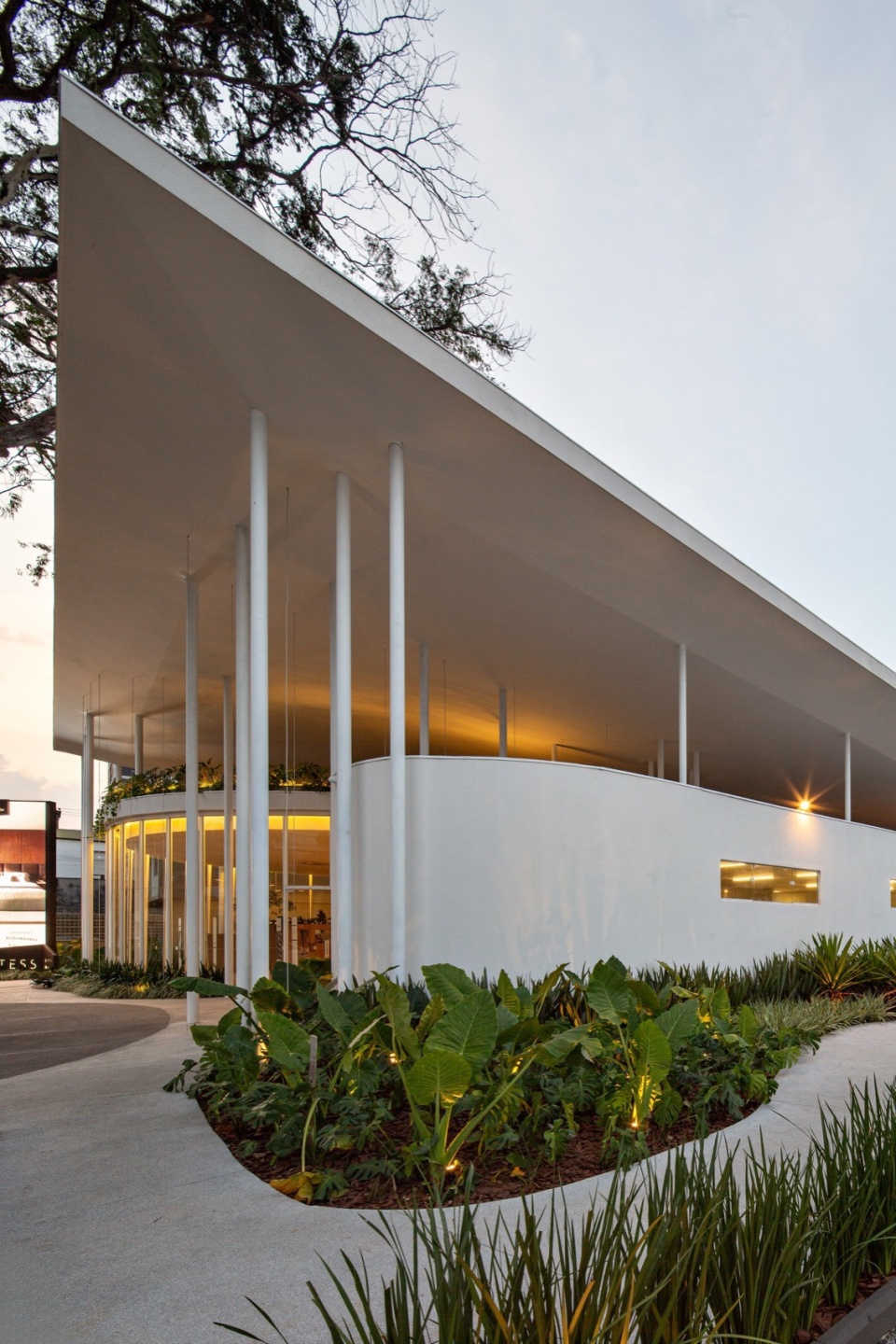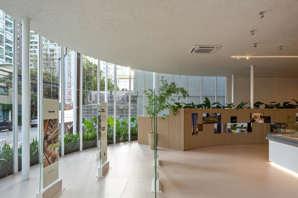 Located in the Brooklin neighborhood, predominantly residential in character, the pavilion adopts a horizontal layout that respects the surrounding low-rise context. The occupation avoids heavy volumes and prioritizes visual permeability, creating a discreet and welcoming architectural presence. The project proposes a reading of lightness and formal silence, integrating naturally into the urban fabric.