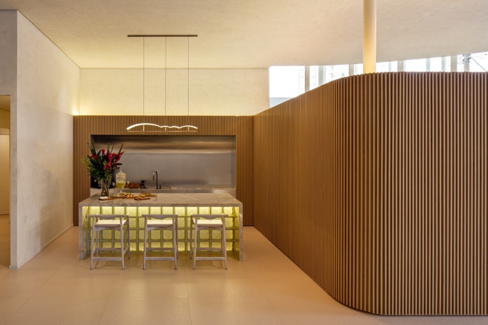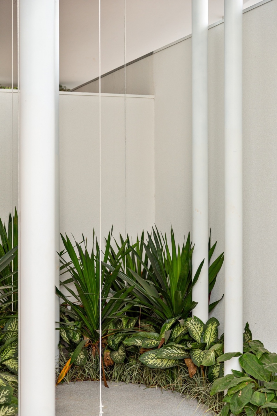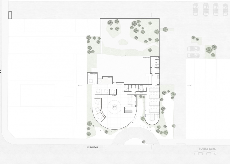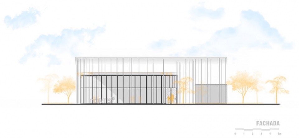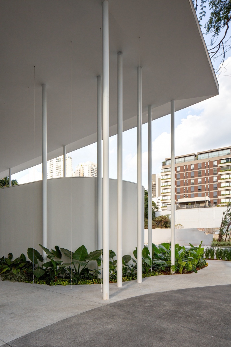 Located in the Brooklin neighborhood, predominantly residential in character, the pavilion adopts a horizontal layout that respects the surrounding low-rise context. The occupation avoids heavy volumes and prioritizes visual permeability, creating a discreet and welcoming architectural presence. The project proposes a reading of lightness and formal silence, integrating naturally into the urban fabric.
