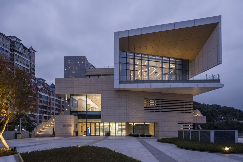 Architecturally, the most striking feature is the three viewing “box” volumes adorning the building. These cantilevered observation decks appear to grow organically from the main structure, each extending toward different directions at the You River confluence, framing the surrounding mountains and waters into a dynamic, flowing landscape painting.