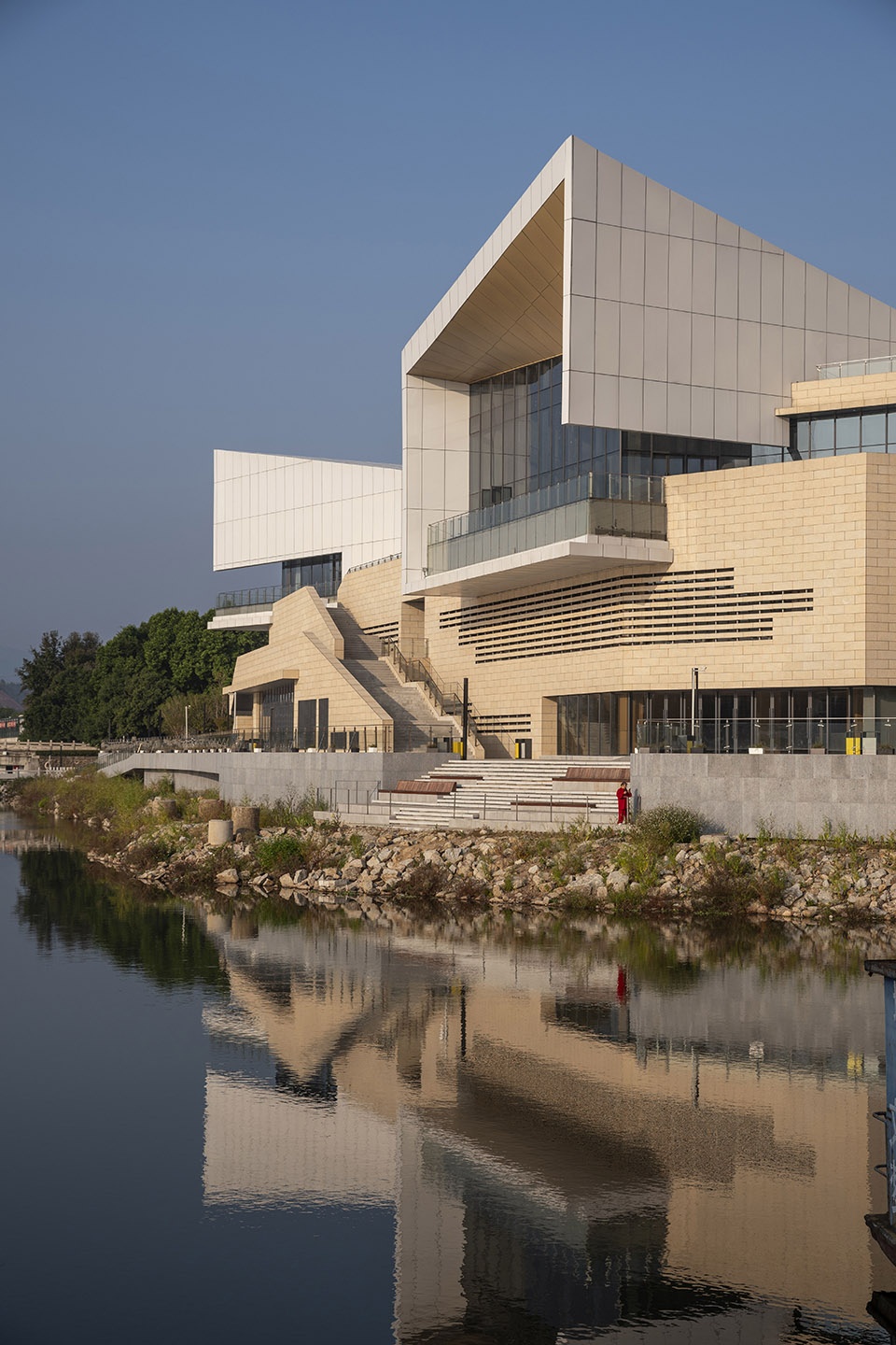 Meanwhile,The architecture stretches horizontally along the riverbank, its terraced volumes stepping down from urban street to waterside—a topographic embrace that weaves panoramic river views into interior spaces. This cascading morphology achieves both vertical continuity and an organic ‘river-architecture symbiosis’, as if the structure grew naturally from the sloping terrain.