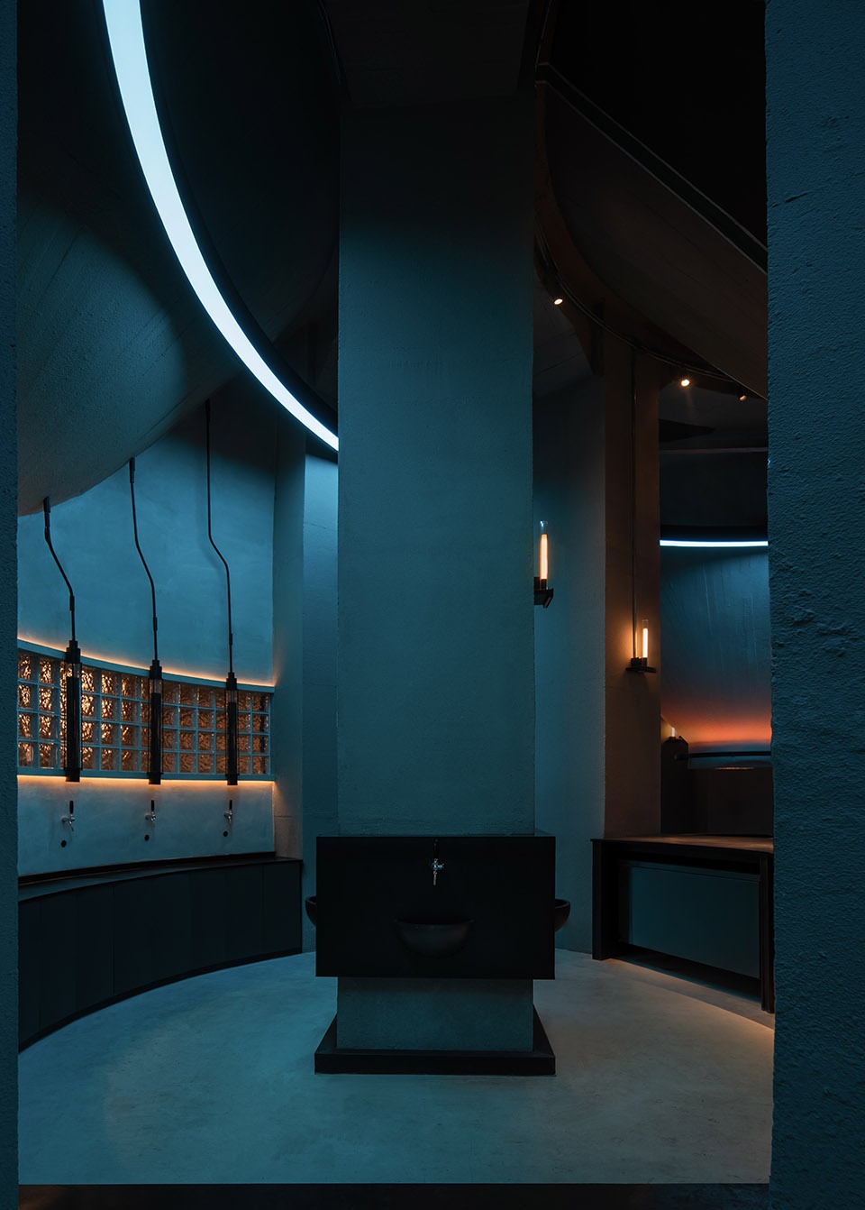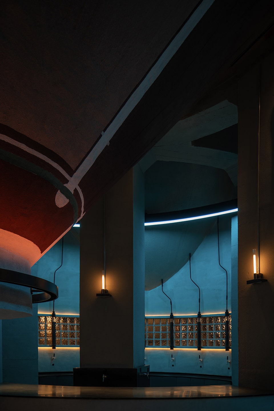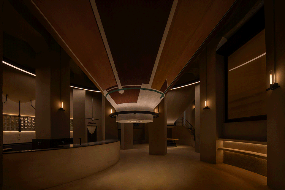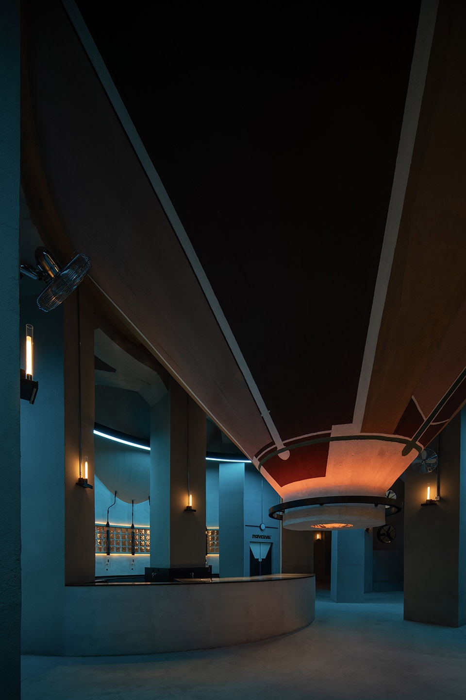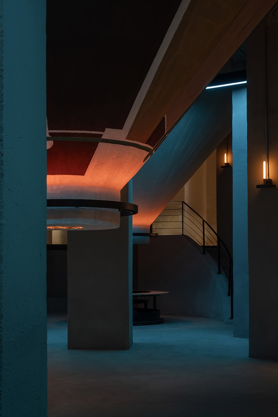 暖光聚焦核心区域营造微醺氛围,光纤在结构间勾勒流动路径,共同编织出或私密或张力十足的场景。材质尤其是原生混凝土在光线的雕琢下,成为空间叙事的重要载体,完美支撑了从日间活力咖啡馆到夜间沉醉酒吧的无缝场景切换。