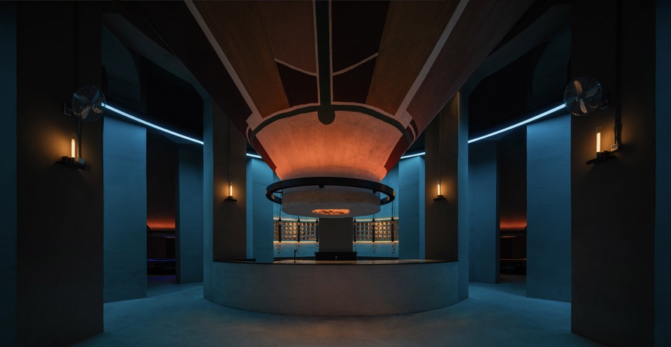 空间布局以中心吧台为核心,其背后是一组巨大的“液体调配机器”,仿佛重新演绎了工业时代的能量中枢。四个巨大的锥桶结构环绕吧台,形成稳定而聚合的围合关系,奠定了空间的仪式感与沉浸基调。