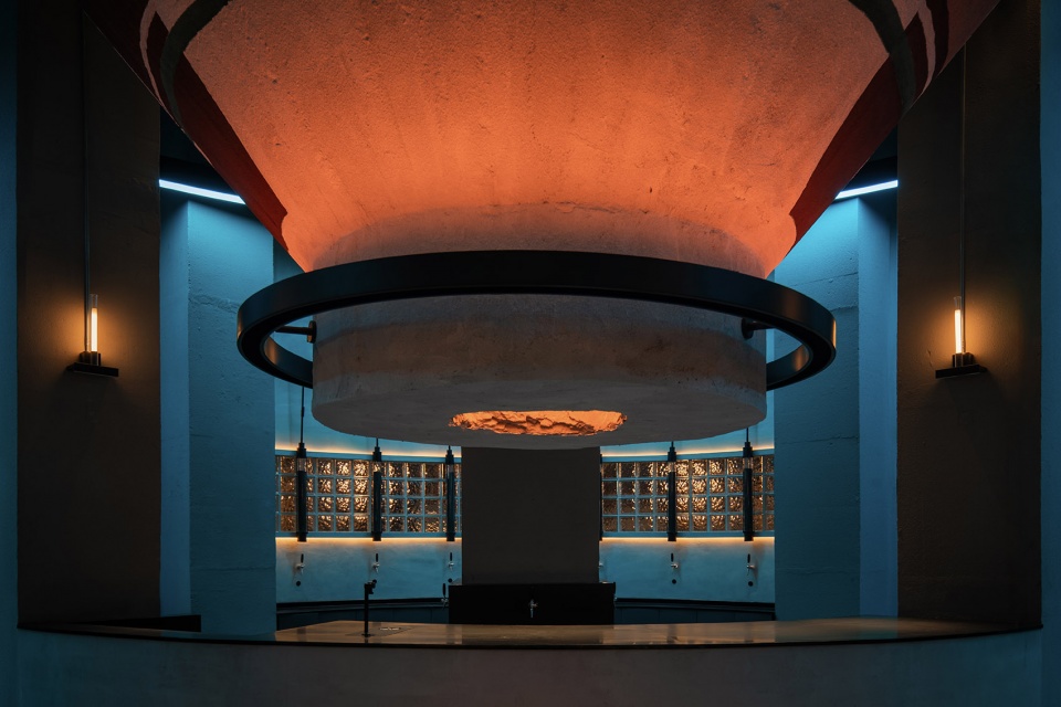 中心位置设有一个巨大的发光圆环,将所有圆锥结构串联起来,构建出一个统一、完整的视觉核心。圆环结构延伸至筒仓外部,将半地下空间与地面景观自然衔接,消解边界,增强空间的开放性与可达性。