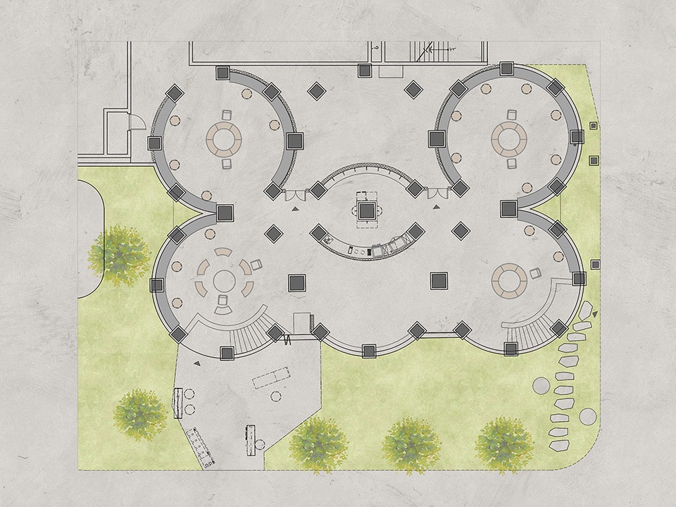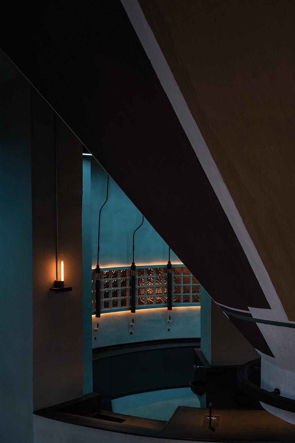 Within a primary silo, PAOMACHANG’s retro-American style is realized through a 1980s color palette, evoking nostalgia. The conical form is abstracted into a sunken patterned installation inspired by coffee filters. This motif—fragmenting from the apex and converging at the base—creates a visual anchor, symbolizing material flow and energy coalescence.