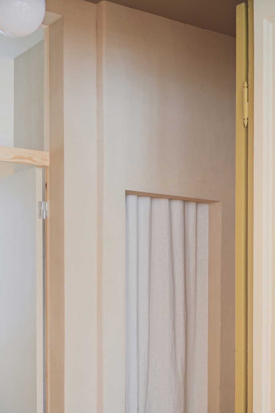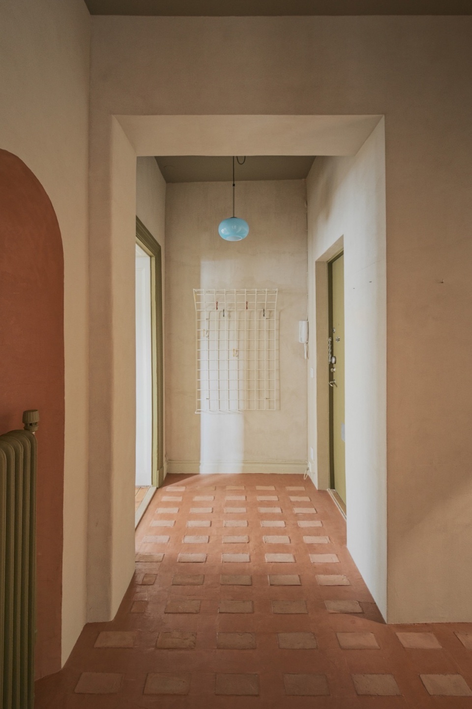 Color is used sparingly but intentionally—sage green doors and piping contrast with the pink-toned walls and floors, subtly highlighting thresholds and adding depth without overwhelming the calm palette.