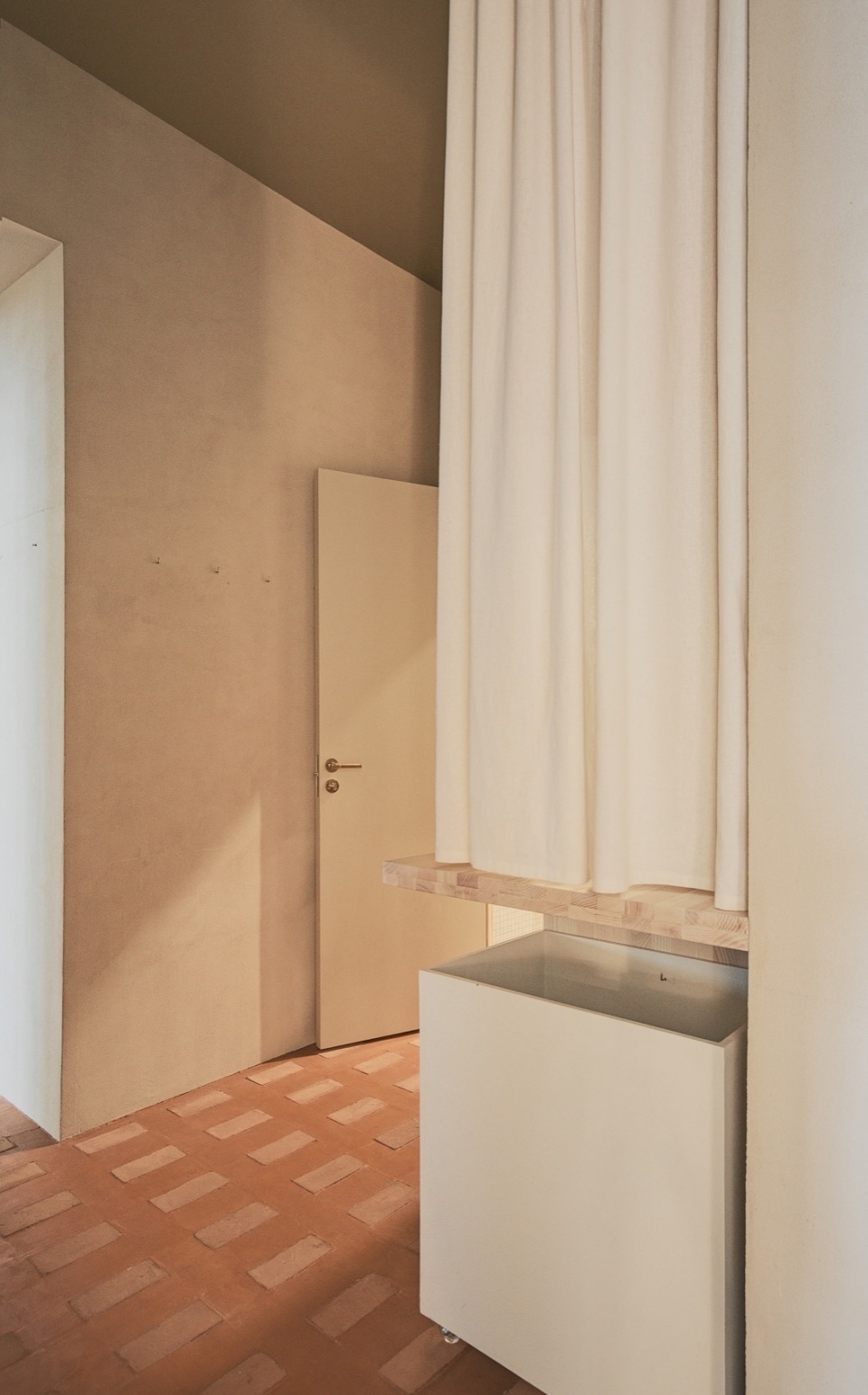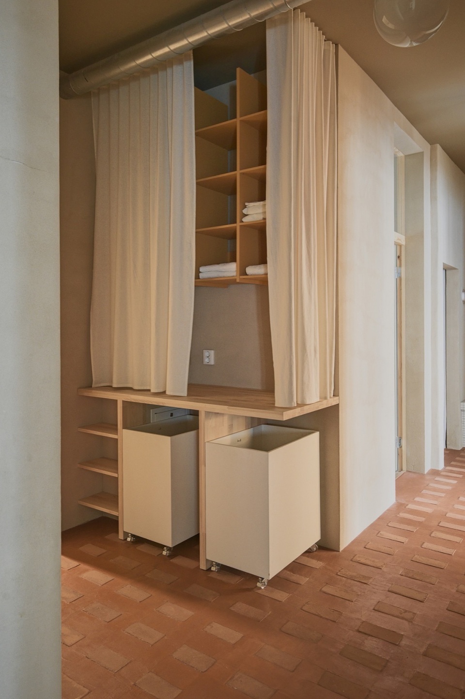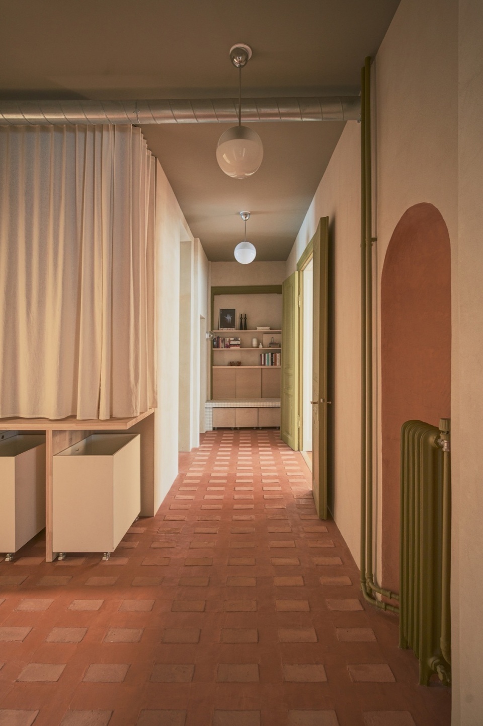 Exposed utilities, such as ventilation ducts and radiators, are left visible and painted in tones that integrate with the palette, further emphasizing the project’s restrained, utilitarian elegance. Custom furniture, textile partitions, and built-in shelving complete a space that is as functional as it is atmospheric.