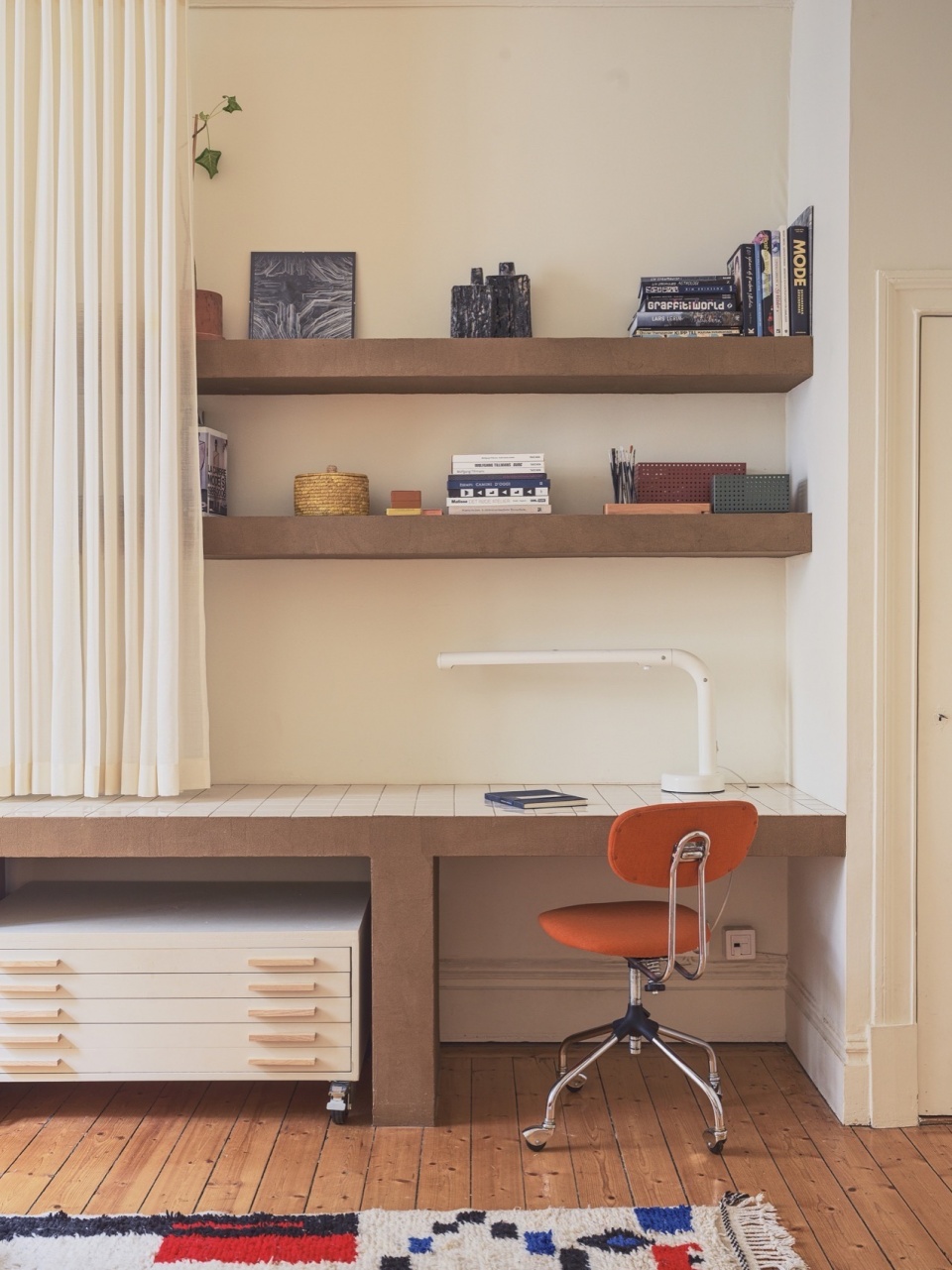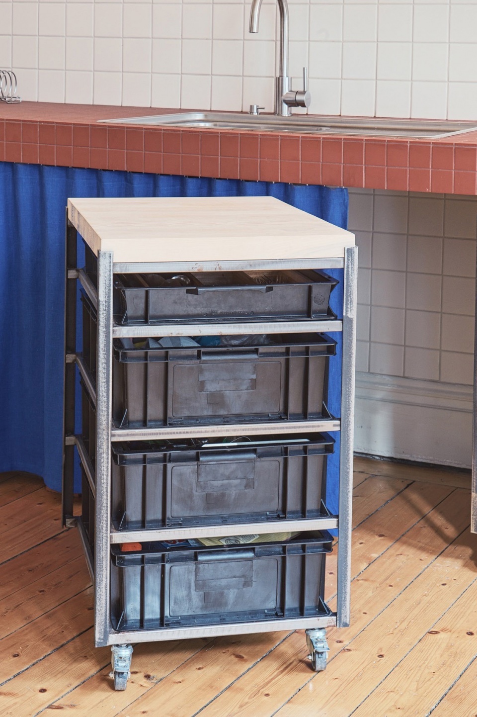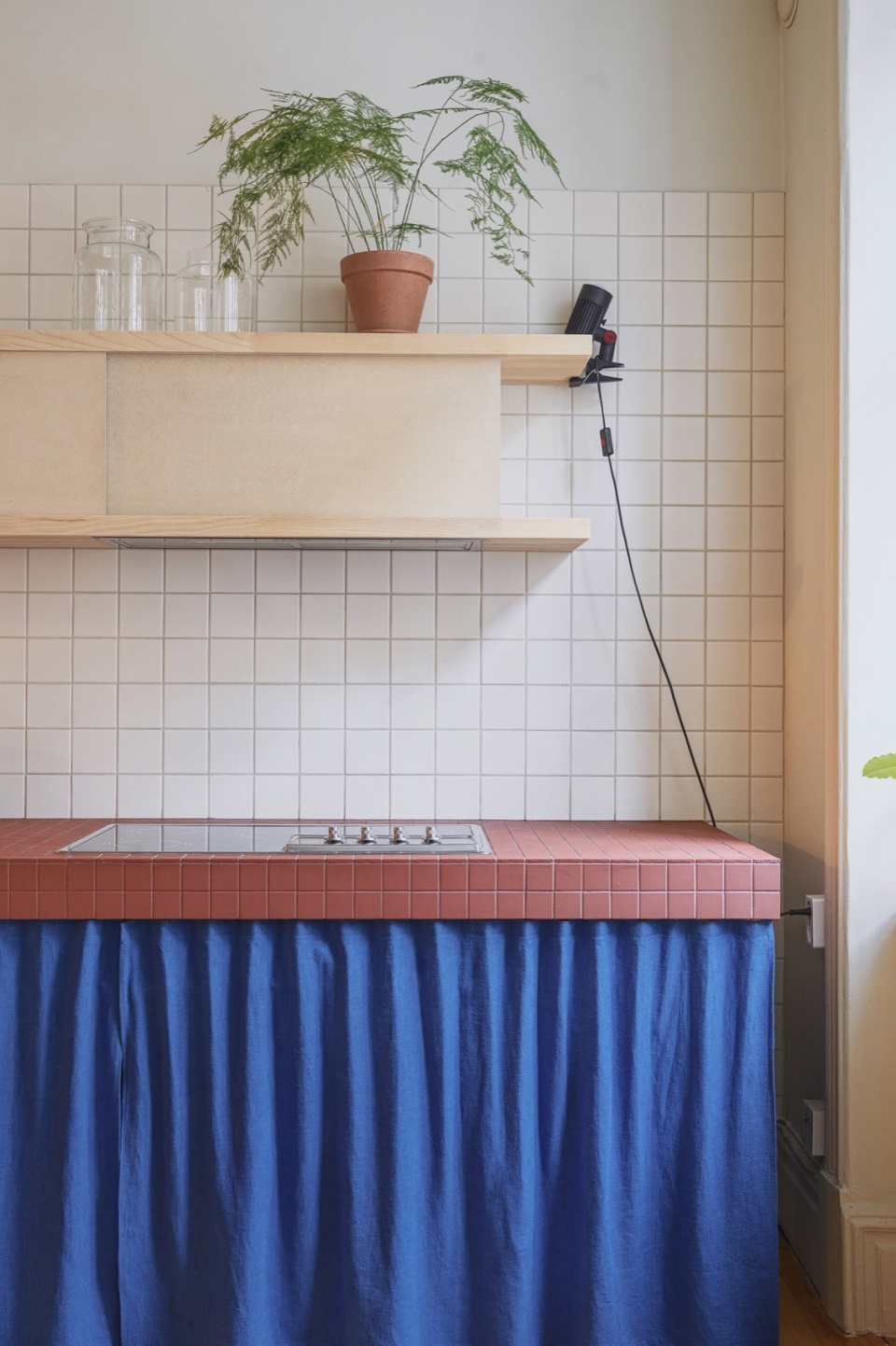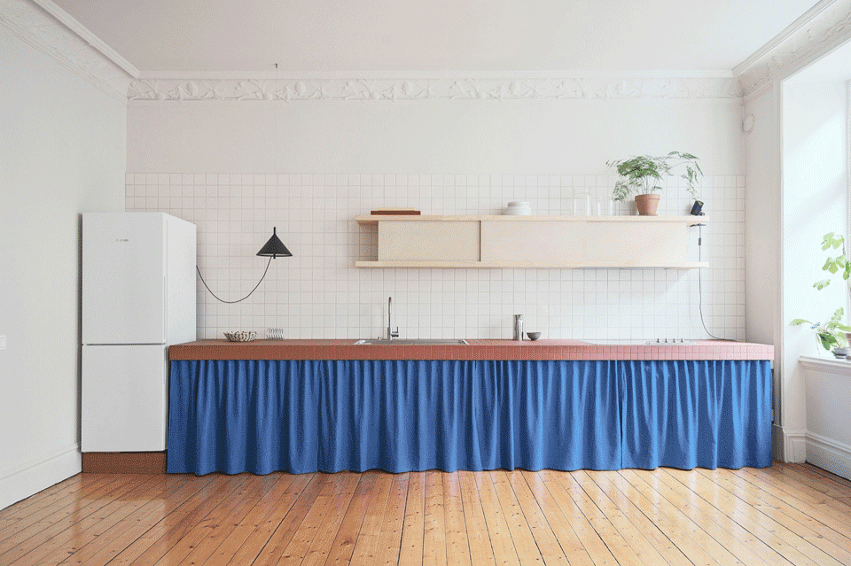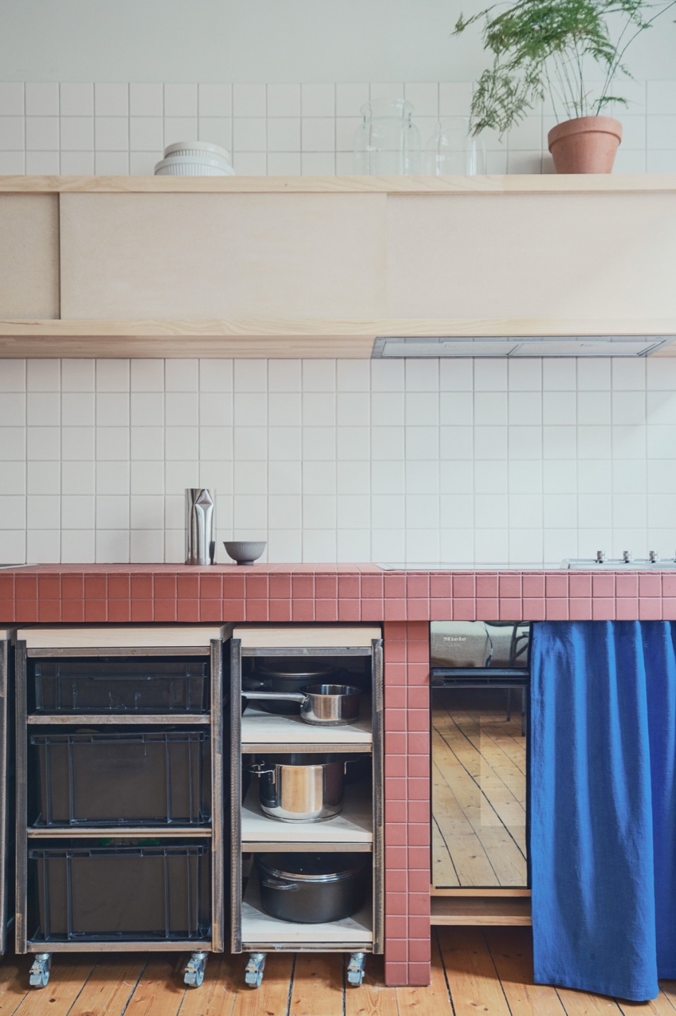 In the kitchen, red ceramic tiles continue across the worktop and backsplash, paired with a curtain in deep cobalt blue that replaces lower cabinet doors—a nod to traditional Scandinavian kitchens. Custom shelving in ash with sliding doors in untreated MDF softens the overall aesthetic while providing generous storage.