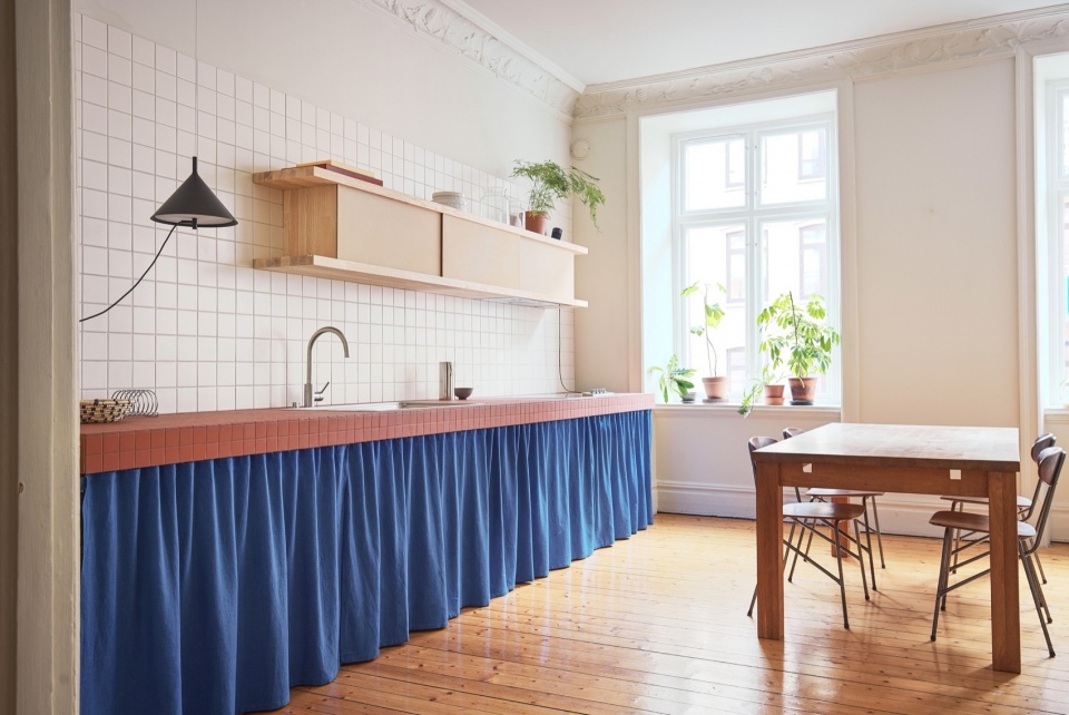 厨房部分,红色陶瓷砖从工作台延伸至防溅墙,下柜则以深钴蓝色的窗帘代替传统门板,向斯堪的纳维亚传统厨房致敬。定制的白蜡木搁架结合未经处理的MDF滑门,软化了整体视觉效果,并提供充足的收纳空间。