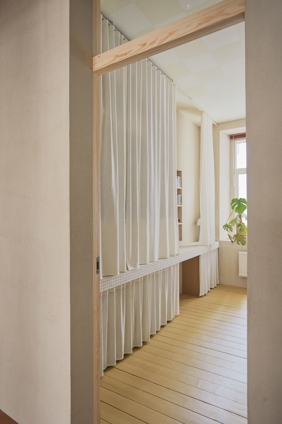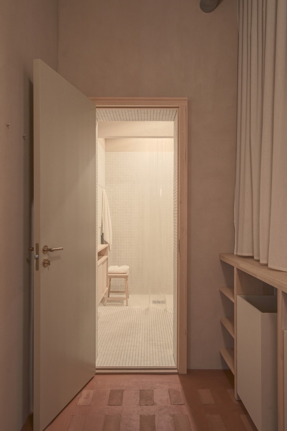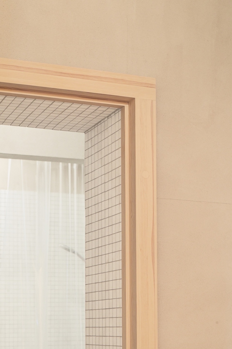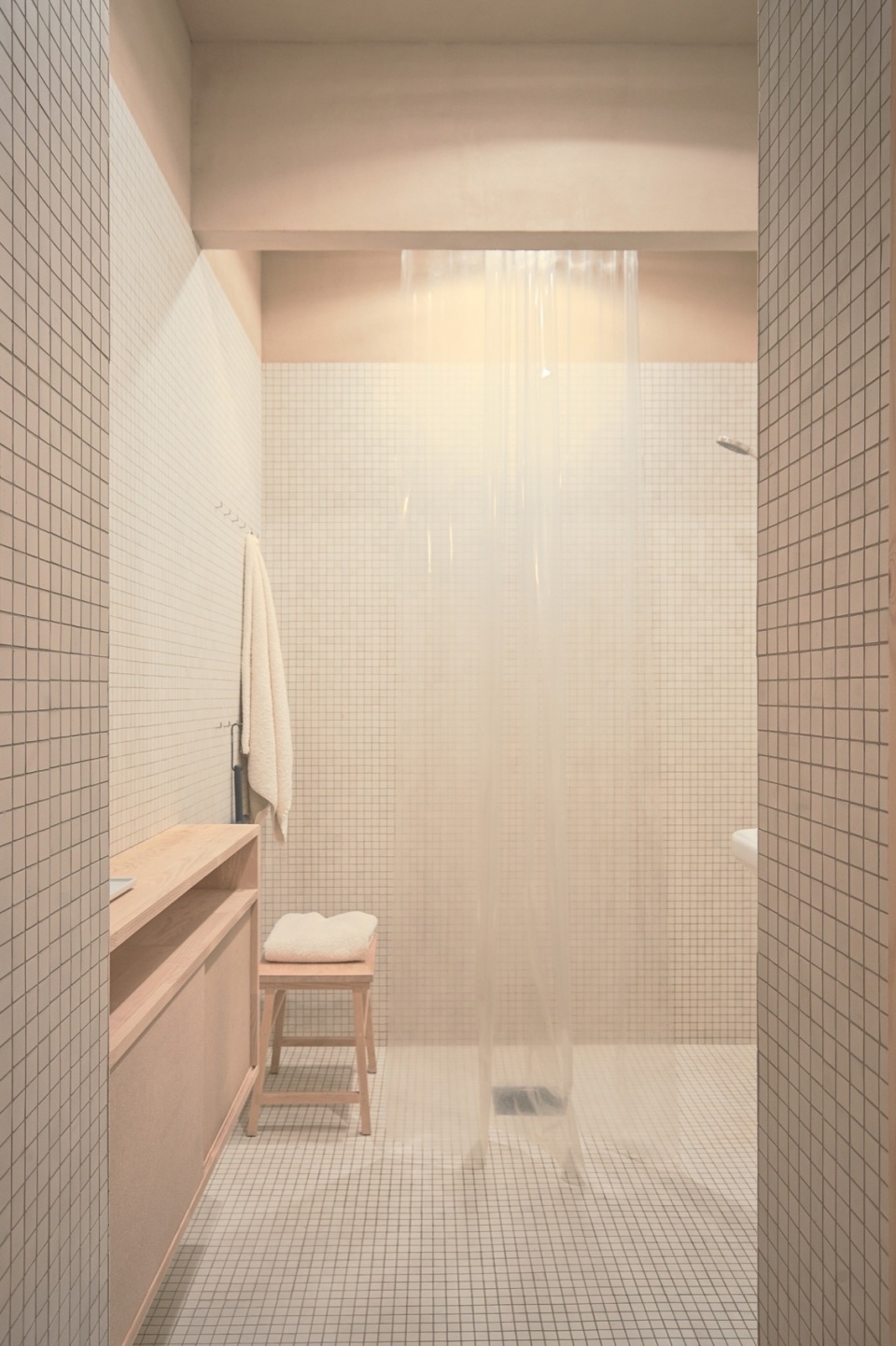 The bathroom features a minimal, grid-tiled interior in matte white, with integrated pine joinery and a semi-translucent shower curtain that filters light. This quiet, functional space aligns with the project’s overall emphasis on material honesty and spatial clarity.