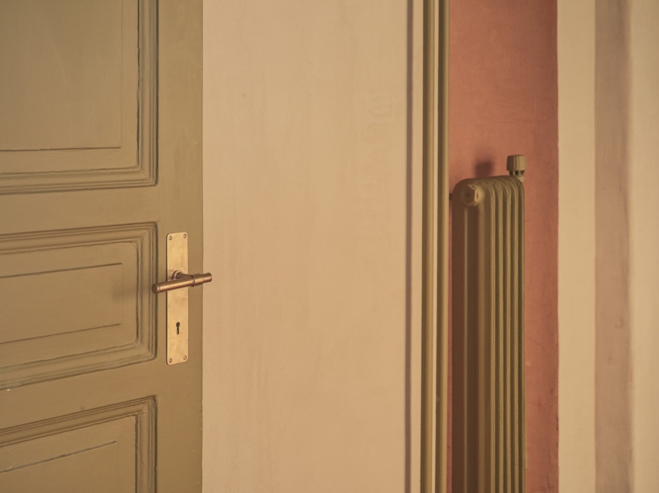 色彩使用克制却极具用意——鼠尾草绿的门与管道对比粉调墙面与地砖,在保持宁静色调的基础上,微妙地点亮空间的层次感。