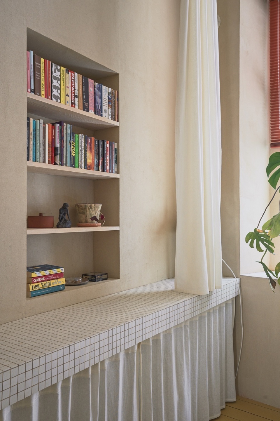 通风管道、暖气片等裸露设施保留可见,并统一刷成与主色调协调的色彩,进一步凸显项目内敛而实用的美学。定制家具、织物隔断与嵌入式书架,共同营造出一个兼具功能性与氛围感的居家环境。