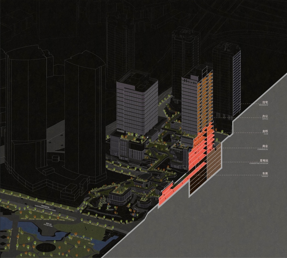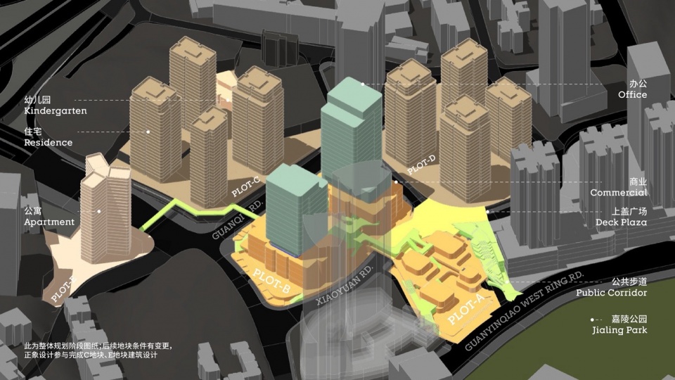 商业地块,是整个街区的心脏。从位置上,它直接面向嘉陵公园及观音桥的成熟商业区,有最重要的展示面;从功能上,也是整个观音桥西拓计划中首发的商业空间,将定义此处的城市生活面貌。