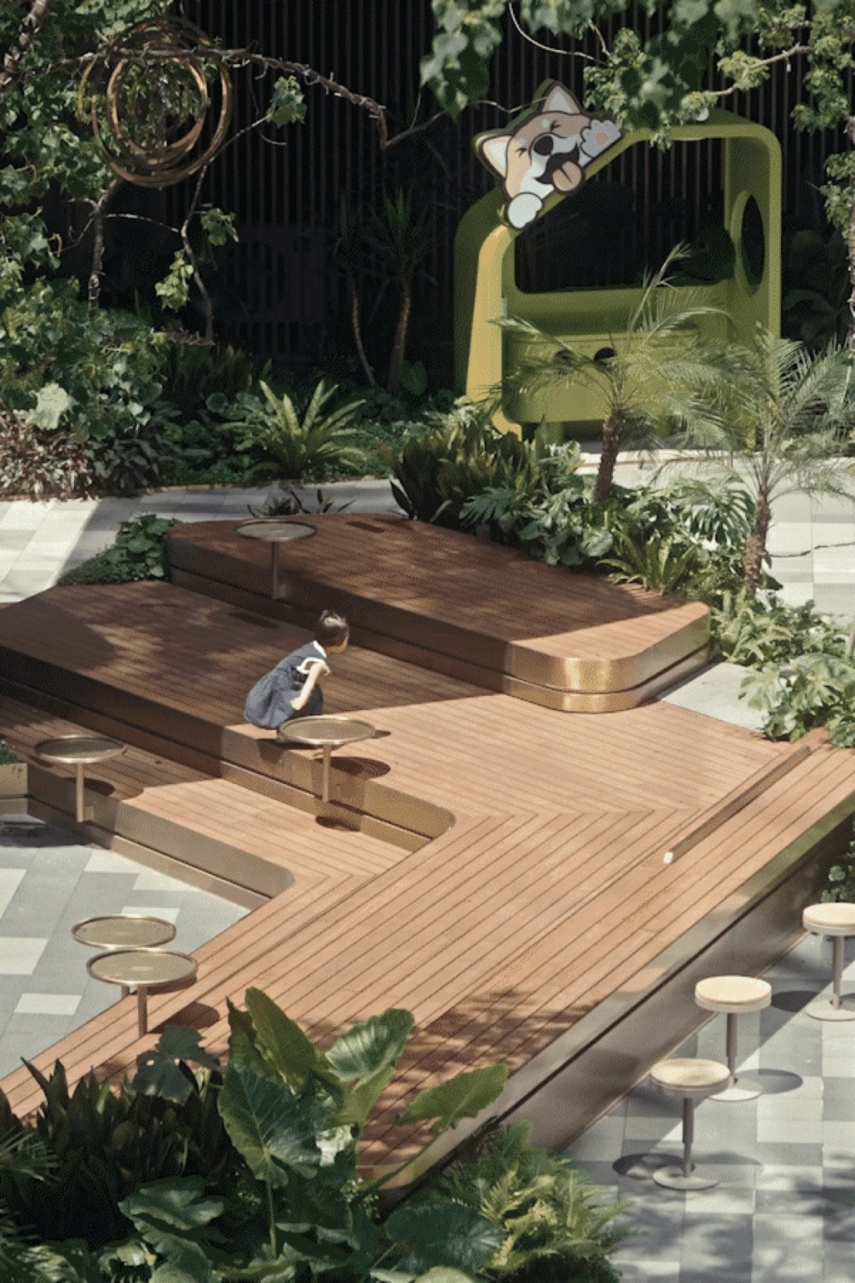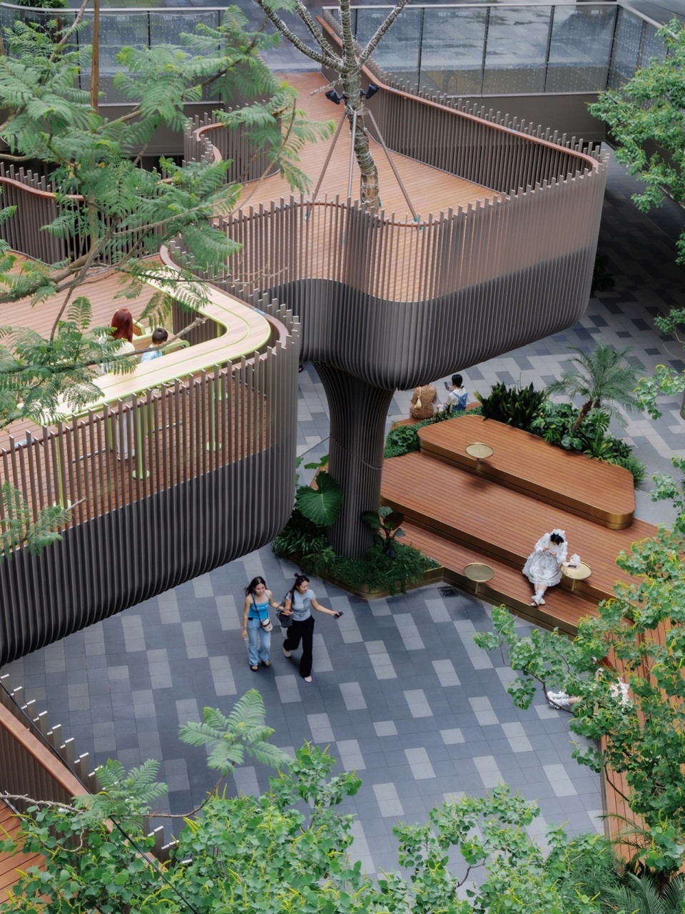 This spatial logic enables unique commercial configurations: shops gain visual autonomy with outdoor seating, some with private “domain gardens” for creative operations, while tiered platforms accommodate diverse marketing events.