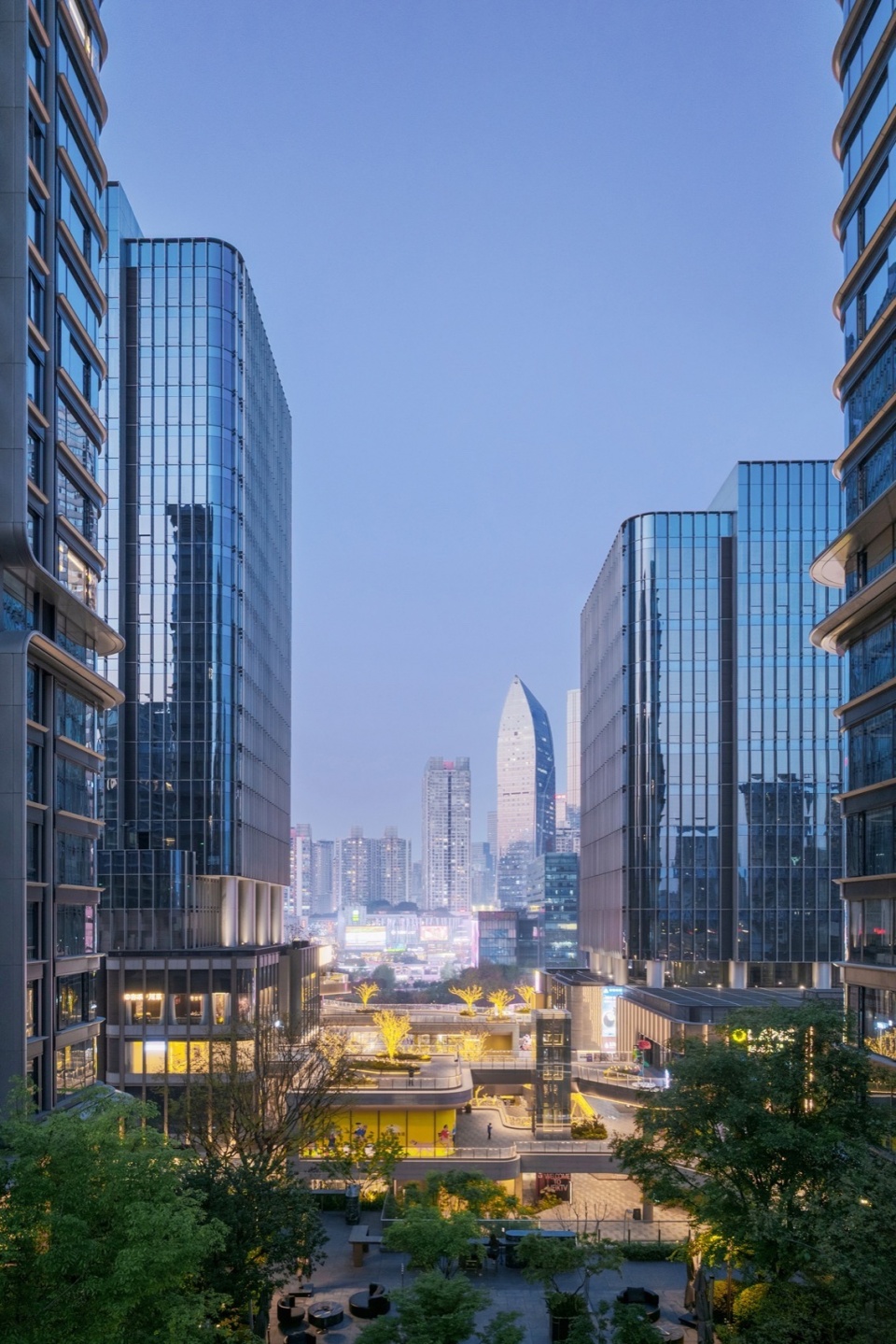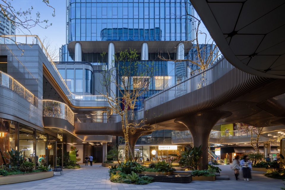 Under this vision, the commercial space transforms into a permeable, porous environment. The massing layout is essentially “carved out” by visual corridors and pedestrian walkways. Through carefully designed openings and pathways, visitors are naturally guided to approach, traverse, and linger within the space. Particularly, the visual corridor preserved between the two office towers creates an “urban viewing platform,” allowing people to enjoy the vibrant cityscape of Guanyinqiao just steps away.