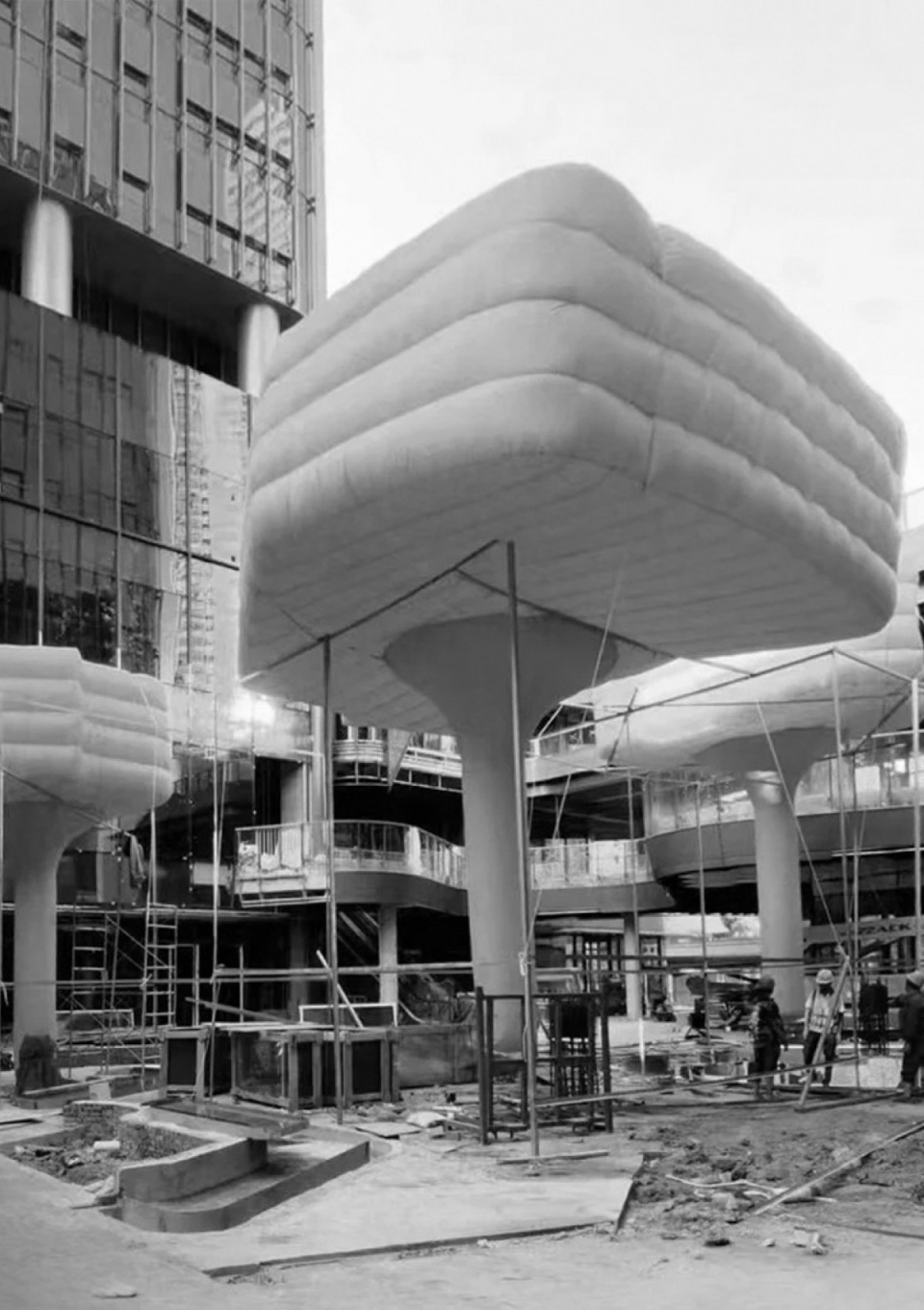 ▼“伞柱”方案与充气样板,”Umbrella columns” prototype testing