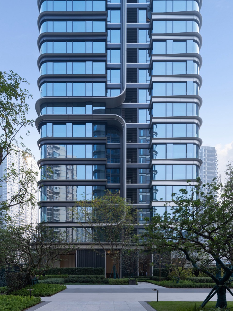由于周边道路的朝向关系复杂,商业和住宅体量都采用圆角设计,以避免产生面向道路的尖锐边缘,这一设计语言也被应用于住宅的立面。倒角盒子,在水平和垂直维度上的延展、堆叠,在有限规模下创造了较多的商业展示面。