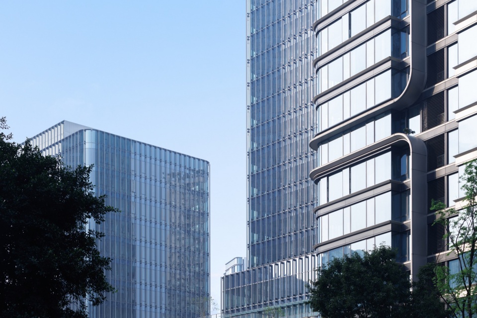住宅的立面,以现代精工标准为基础,融合山城垂直、挺拔的气质。水平线条律动中,连贯的竖向线条切分出挺拔高耸的建筑体量,使之显得动感、年轻。商业立面局部点缀景观电梯、特色穿孔板,在视觉上提供丰富性。办公立面同时做了外置的格栅加平推窗,满足通风的同时减小开启扇对立面的整体性的影响。5个地块上的建筑共享统一的语言母题,但又各有不同的色彩,统一中见多样。