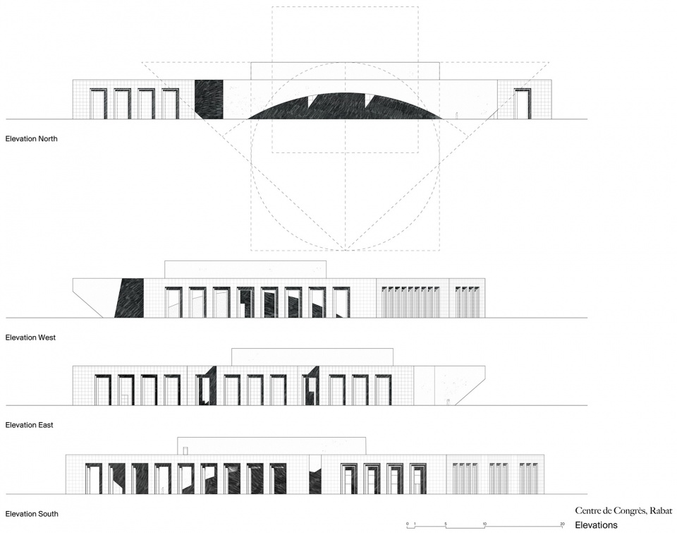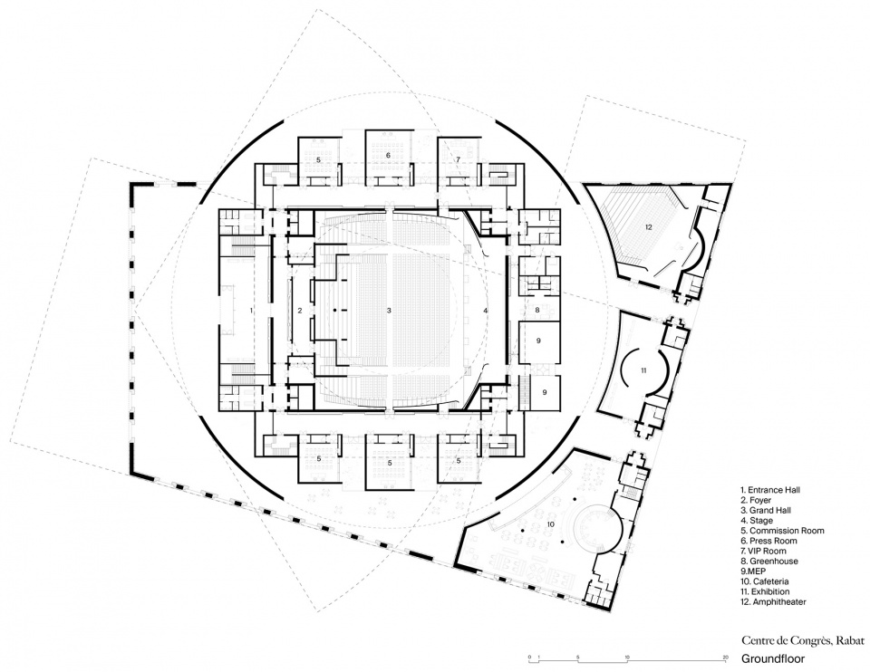 该建筑的平面由两种纯粹的几何形体——圆与方——所定义。一个自立的弧形墙体围合出中央主会堂,形成一个圆环;而内部的主会堂空间则为一个方形。圆与方之间的夹缝容纳了多个中小型会堂、会议室、酒吧、咖啡厅、交通流线与配套服务空间。建筑的外部庭院也提供座位与聚会场所,可眺望周边的运动场和林地景观。主环墙体上雕刻出一系列拱形大门洞,仅在四角触地,其余部分保持开放,从而营造出对公众的欢迎姿态。其效果如同一份邀请,邀请人们走进会议中心——一个旨在成为充满活力、开放包容的空间,容纳多元人群与丰富活动的场所。