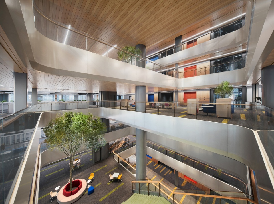 J&A匹配新型工作模式及企业组织架构的功能布局,打造微众专属企业办公模式。通过多层挑空中庭与模块化的设置,打破传统办公的封闭边界,形成垂直空间内的立体网络。适宜的人体的舒适尺度与通透视野,既保障了高效协同,又消解了高层建筑的物理隔阂。