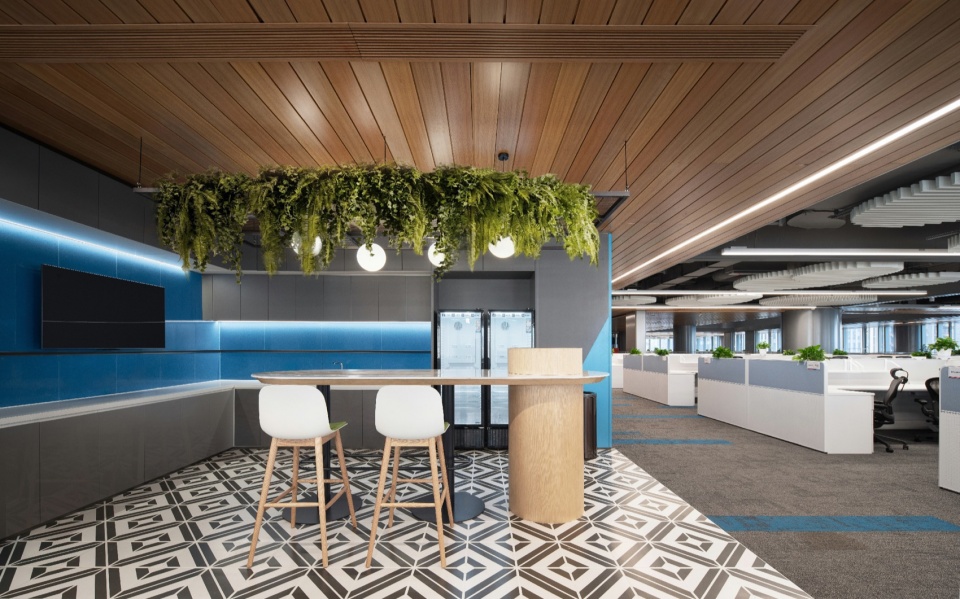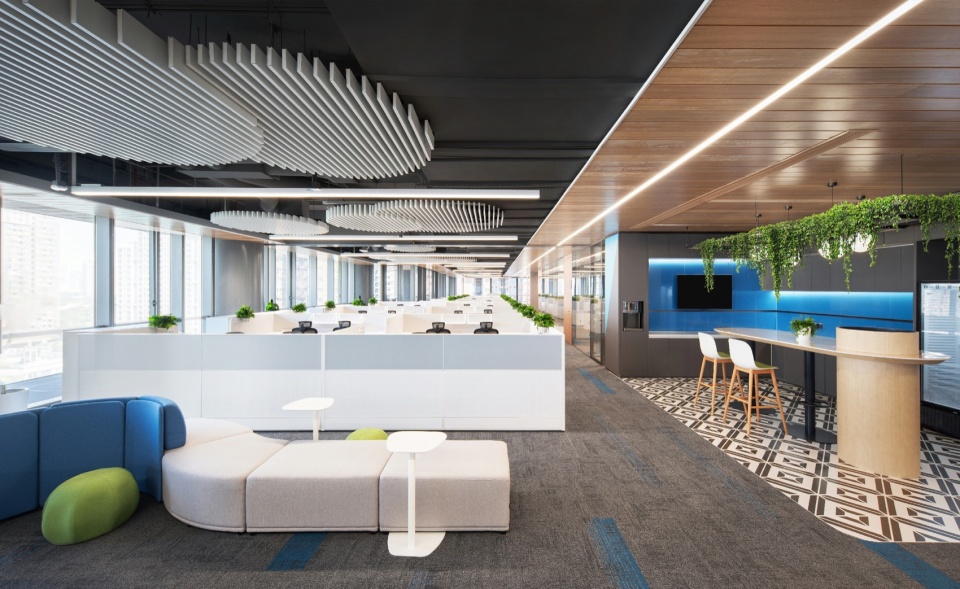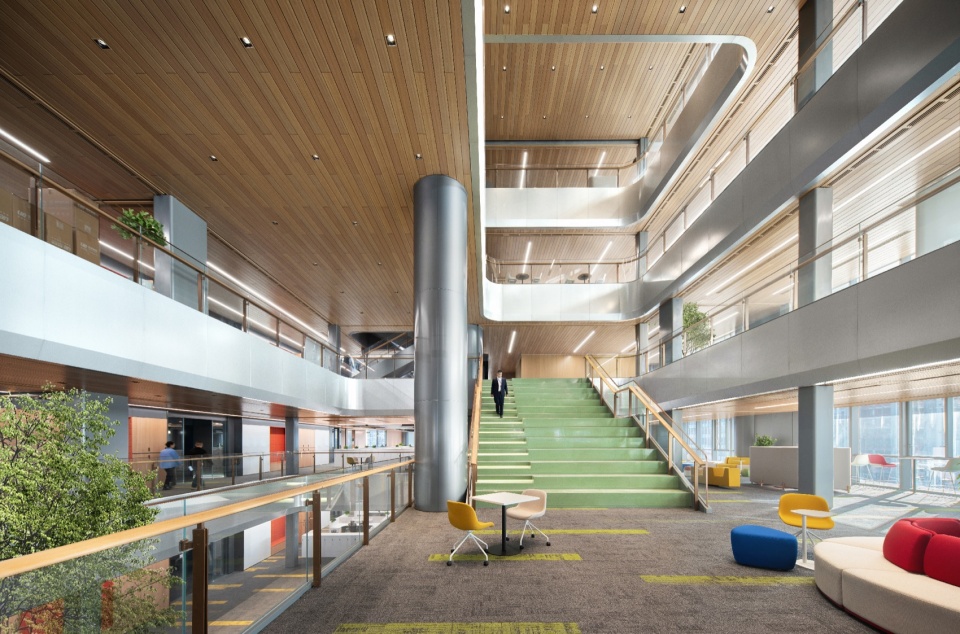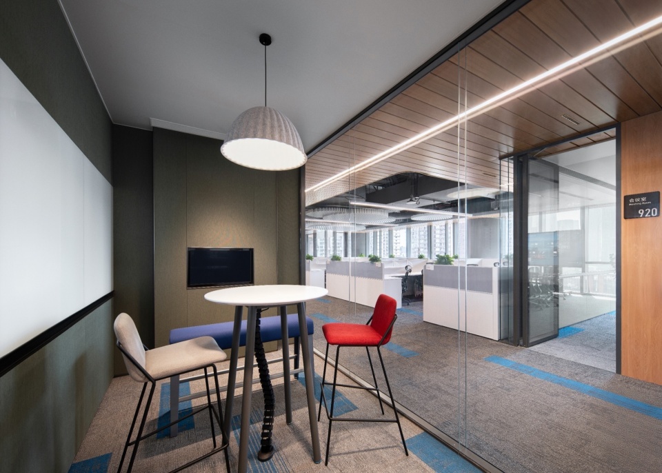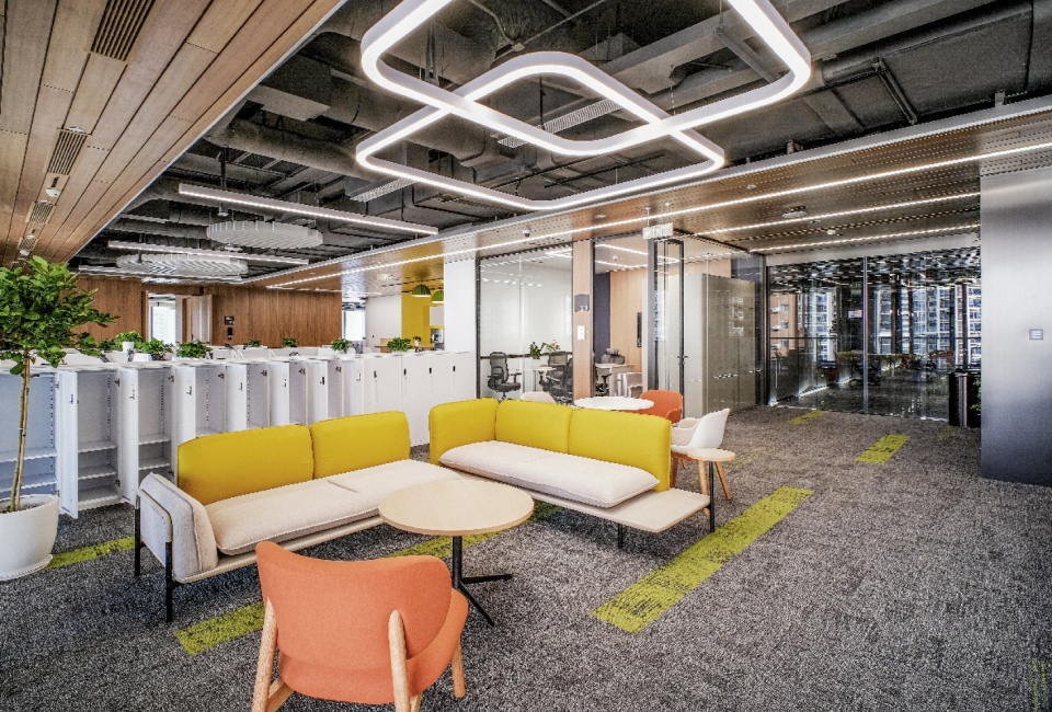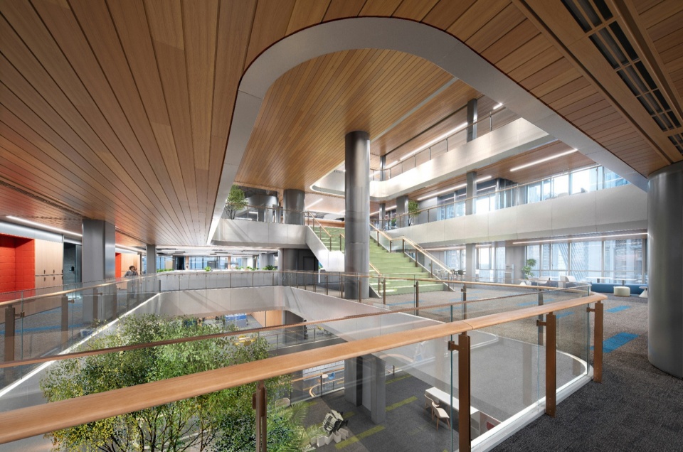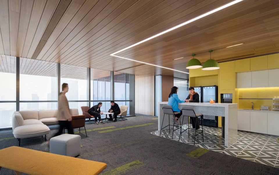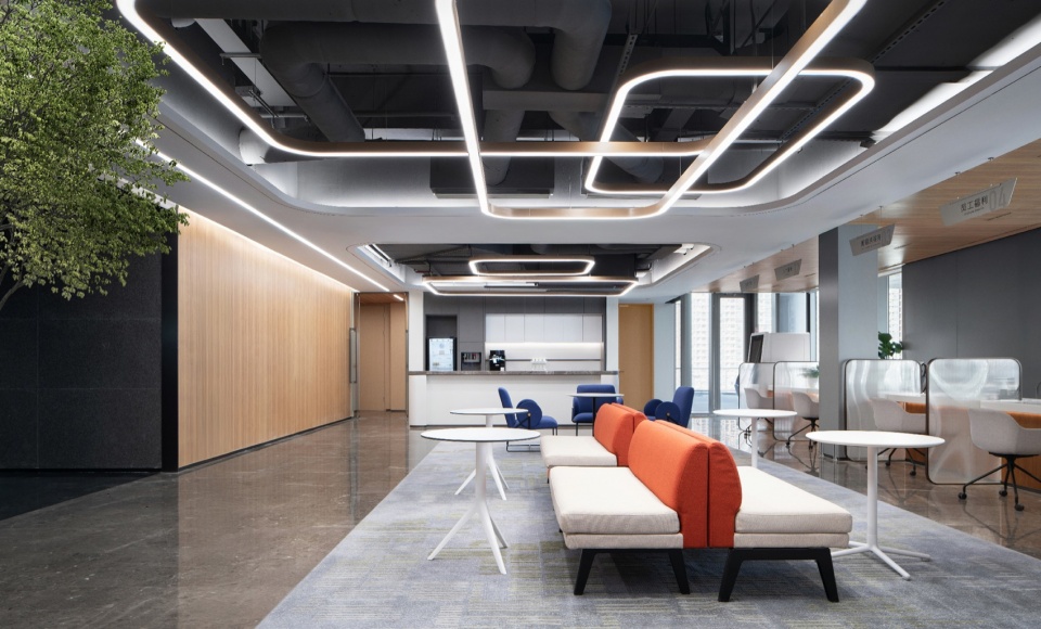 可持续性并非停留在技术参数的罗列,而是渗透于空间使用的每一处细节。装配式设计的使用,防火玻璃隔断、吸音毡板等均采用模块化预制设计,最大程度降低现场污染。J&A希望每一个空间都能在平衡甲方的战略需求之下,将城市规划、建筑逻辑与室内场景无缝衔接。