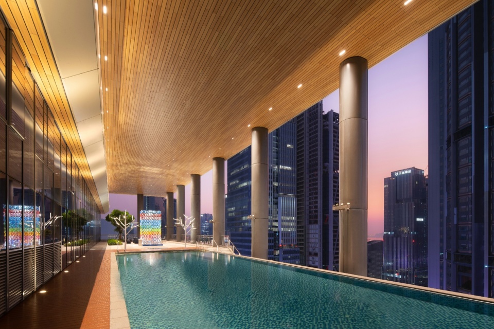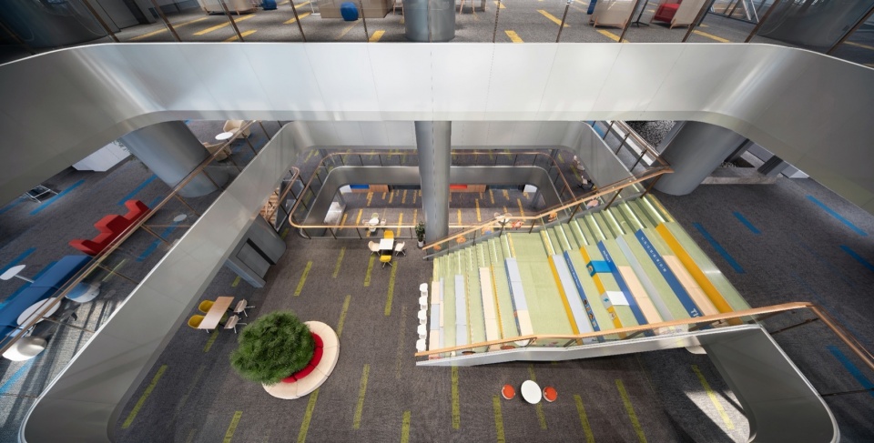 Breakout areas feature Lingnan-style mosaic patterns on the floor and a similarly vibrant color palette. An aerial multi-level sports field and swimming pool integrate wellness concepts into daily settings. Behind these design strategies lies J&A’s profound insight into the financial industry sector: in the digitalization trend, only by seamlessly integrating technology, ecology, and human-centric needs can an enterprise space with enduring vitality be forged.