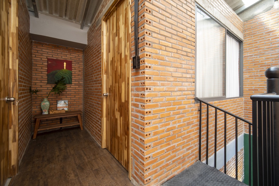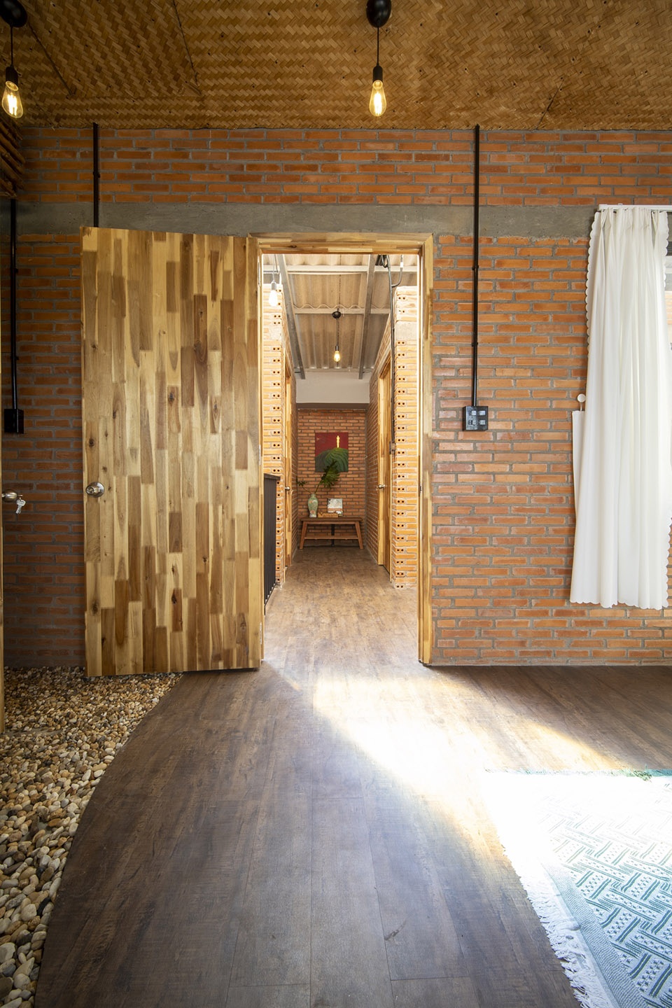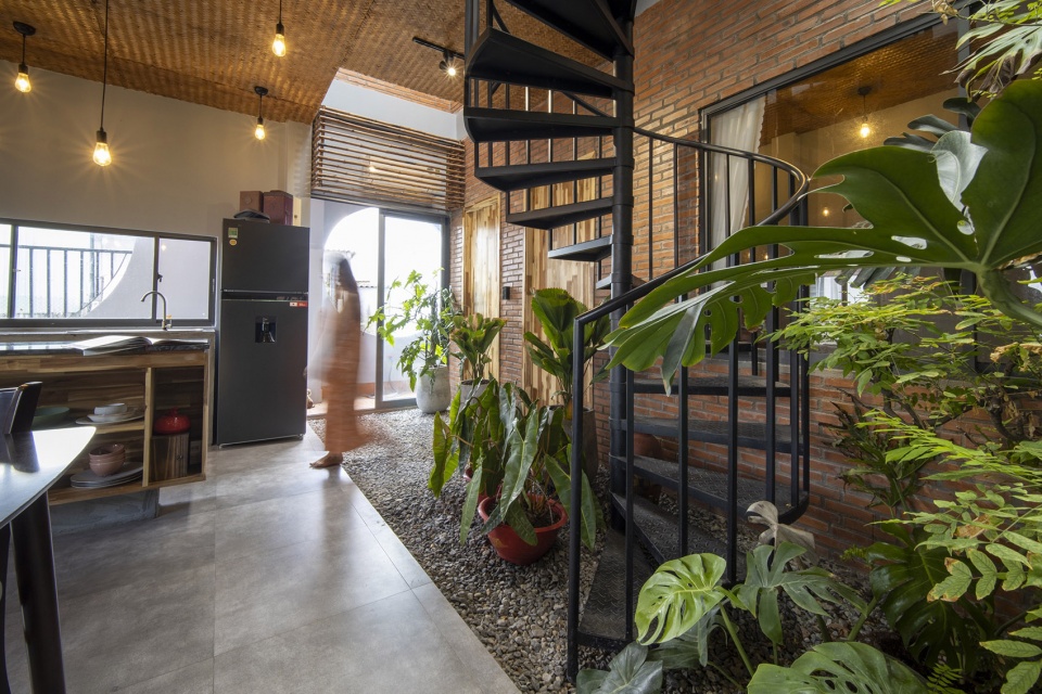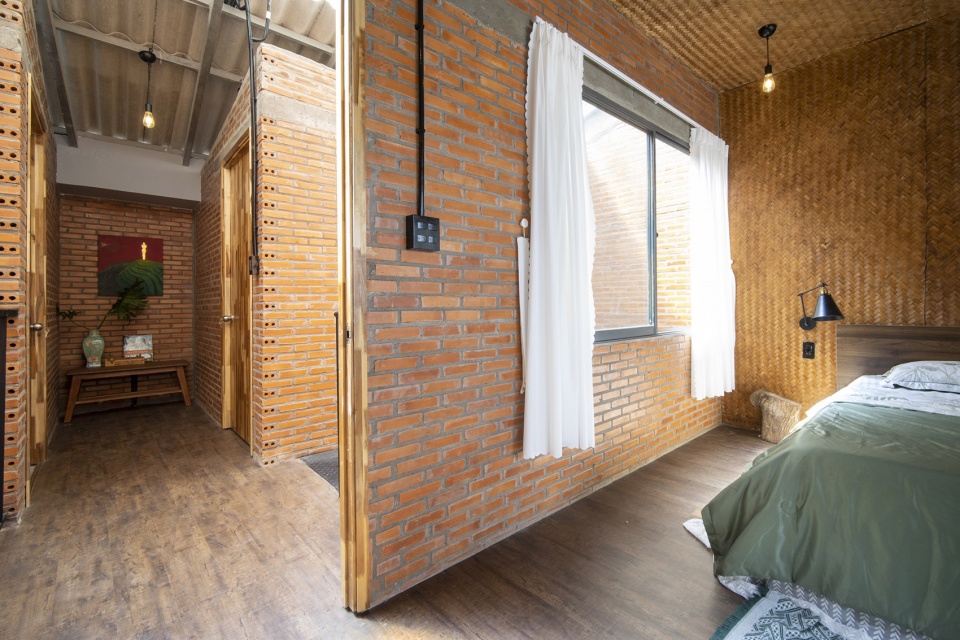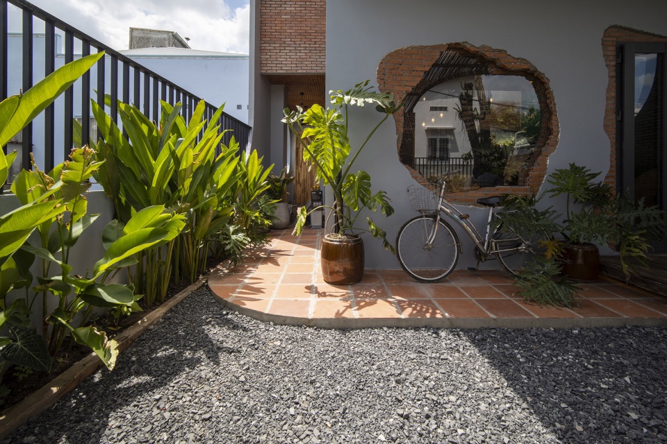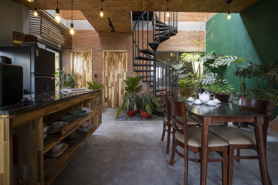 During construction, the architectural team at Archiro Vietnam worked closely with local artisans to develop an exposed brick wall technique. This method not only saves materials and optimizes construction costs but also ensures a high level of aesthetic quality. Each brick is carefully arranged to create balance and stability for the house while concealing the main structural elements. This approach not only enhances the natural beauty of the house but also fosters a deeper connection to local craftsmanship and culture.